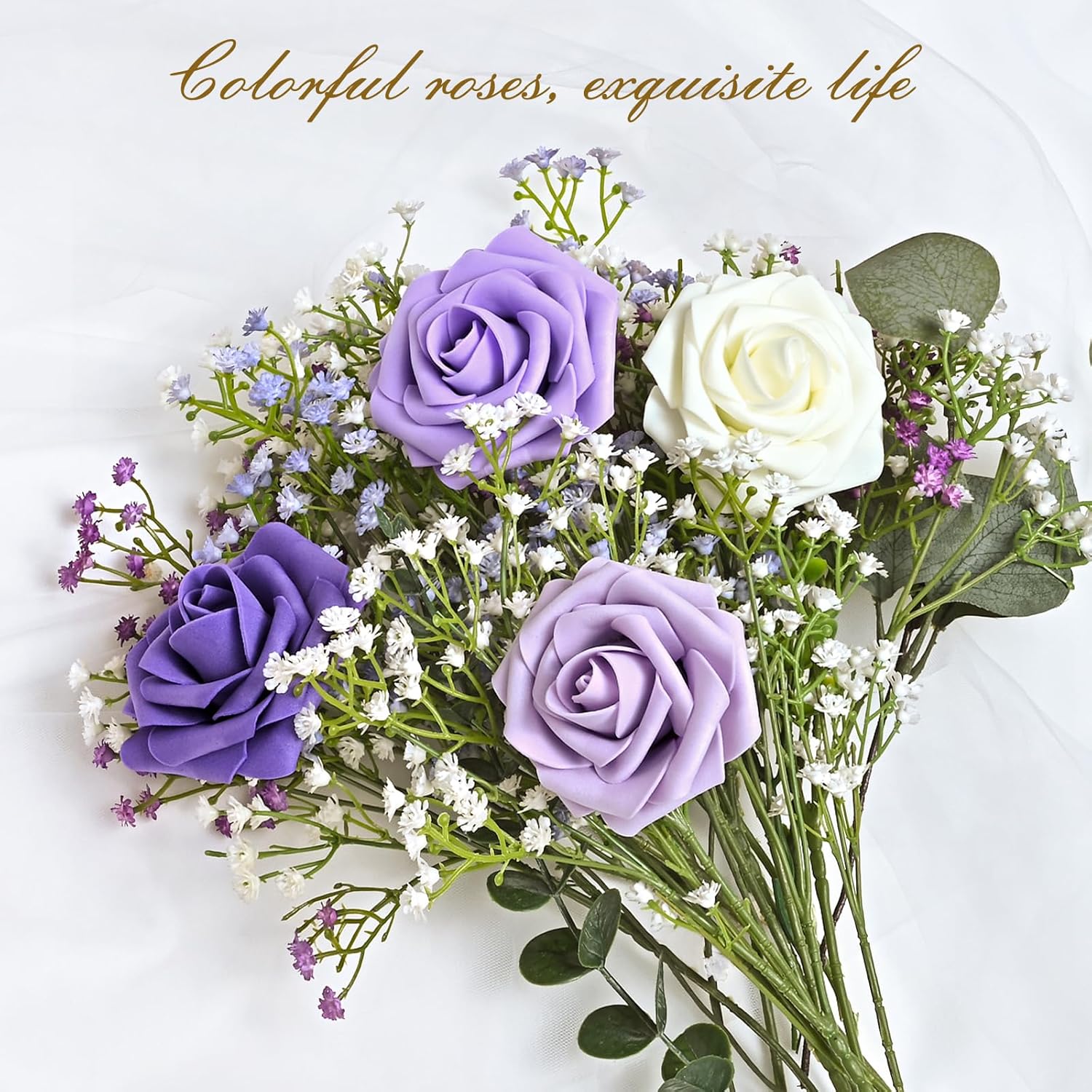 BLEUM CADE 36Pcs Artificial Flowers Fake Roses with Stems, Gradient Purple Boxed Foam Roses for DIY Bouquets Centerpieces Wedding Party Arrangement Bridal Shower Decor