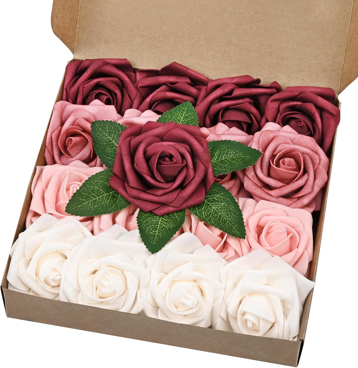BLEUM CADE 16Pcs Artificial Flowers Fake Roses with Stems, Gradient Burgundy Boxed Foam Roses for DIY Bouquets Centerpieces Wedding Party Arrangement Bridal Shower Decor