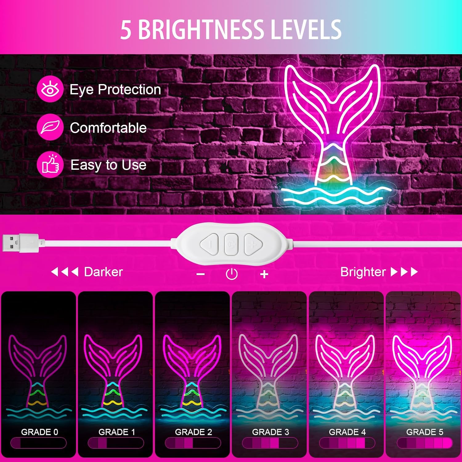 - 🧜♀️【DIMMABLE AND BRIGHT MERMAID NEON SIGN】This mermaid neon light upgraded the adjustable brightness function, very friendly to girls room decor, led mermaid room decor for girls is pretty and not harmful to the eyes, you can used a dimmer to adjust 5 levels of brightness to meet kids needs. I hope our mermaid neon light sign can give you a happy mood.