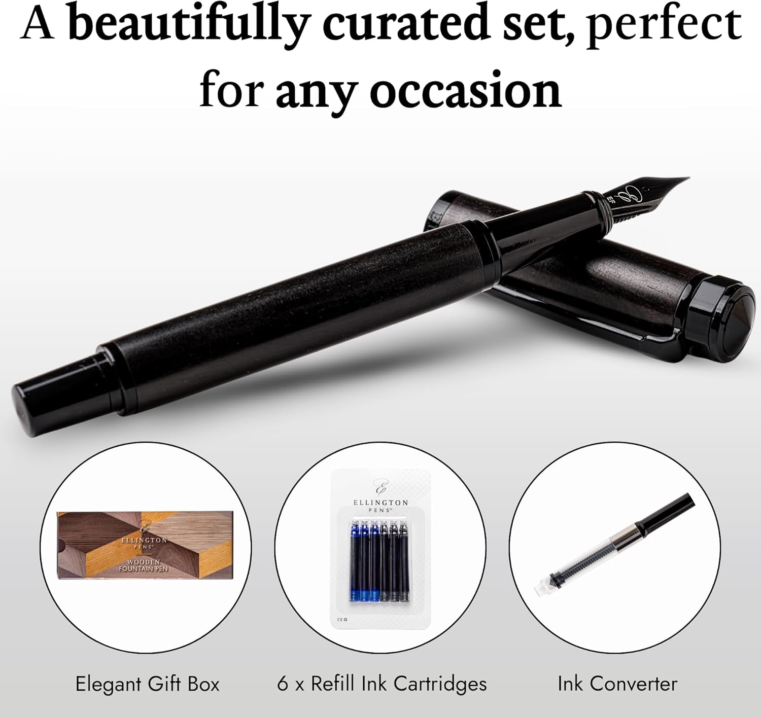 Ellington Pens Elegant Wood Fountain Pen Set β Includes Wooden Pen Box, Ink Converter, 6 Ink Cartridges, and Gift Box β Writing, Calligraphy