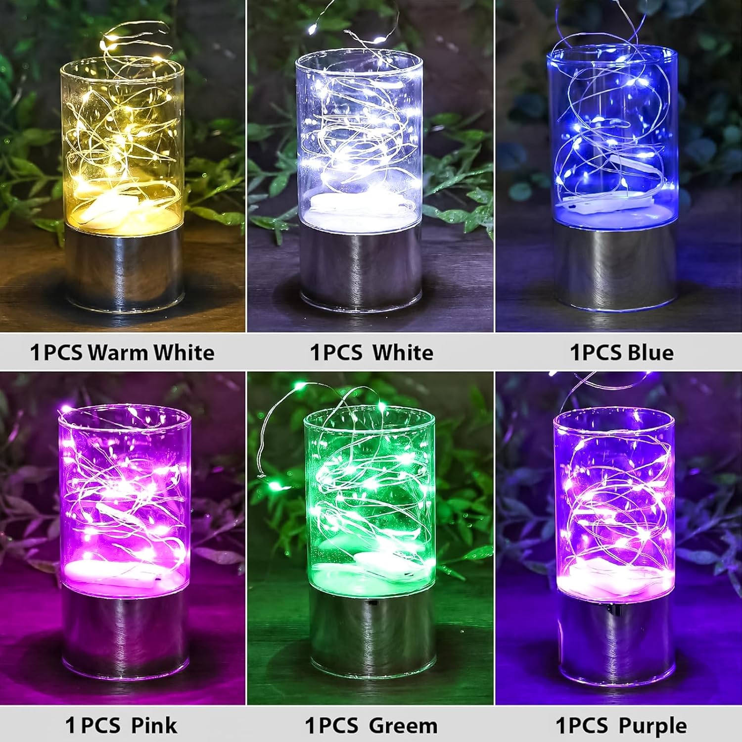 - 【Fantastic Multicolor Lights】: 6 separate mini fairy lights battery powered, Total included 1 x warm white, 1 x white,1 x blue ,1 x green, 1 x pink and 1 x purple lights. Made of 7ft high quality Silver coated copper wire, It’s flexible, strong and durable. Perfect for your crafts project , floral arrangements plants, signs, furniture glass jars, vases, wine bottles or other decorations.