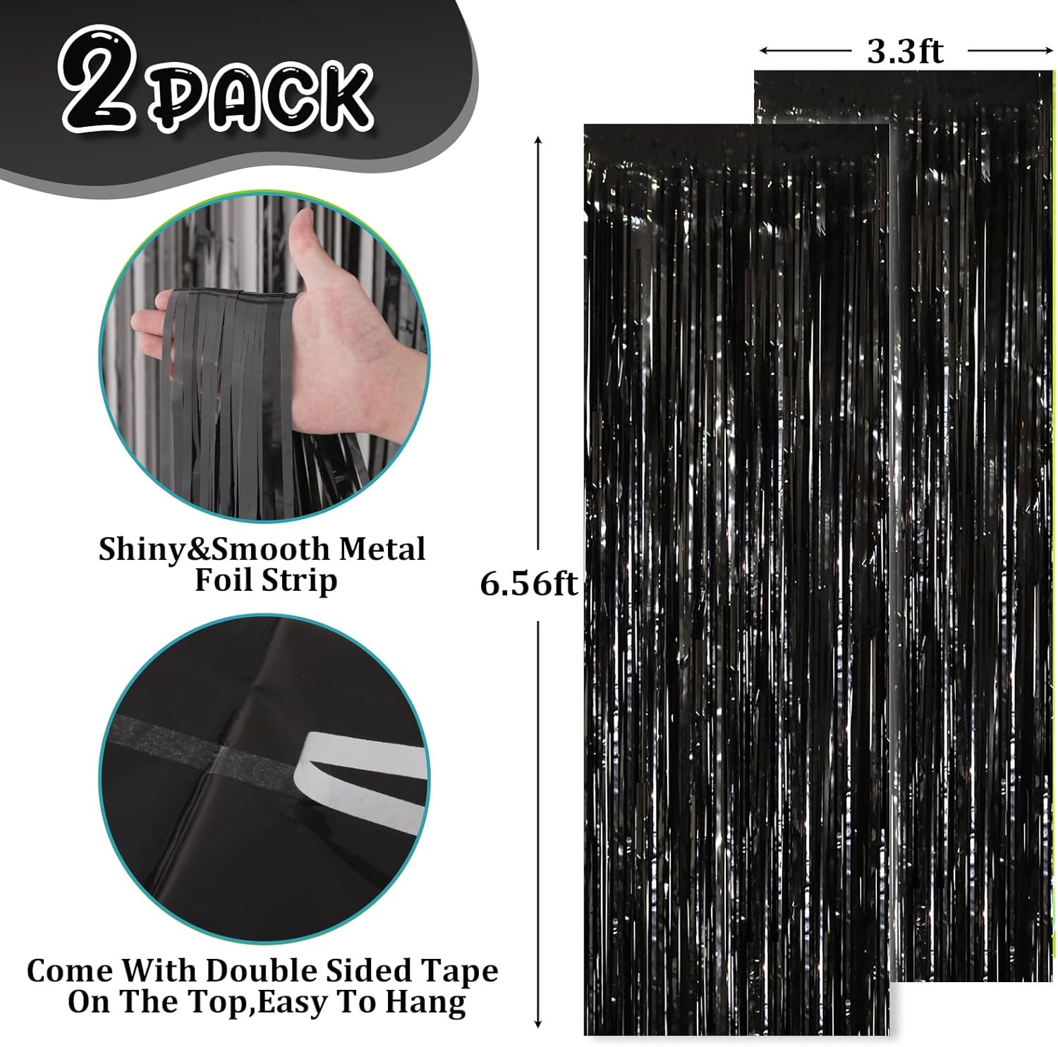 2 Pack Black Tinsel Foil Fringe Curtains, Black Party Decorations, Metallic Tinsel Party Streamers Backdrop for Birthday Halloween New Years Graduation Party Decorations