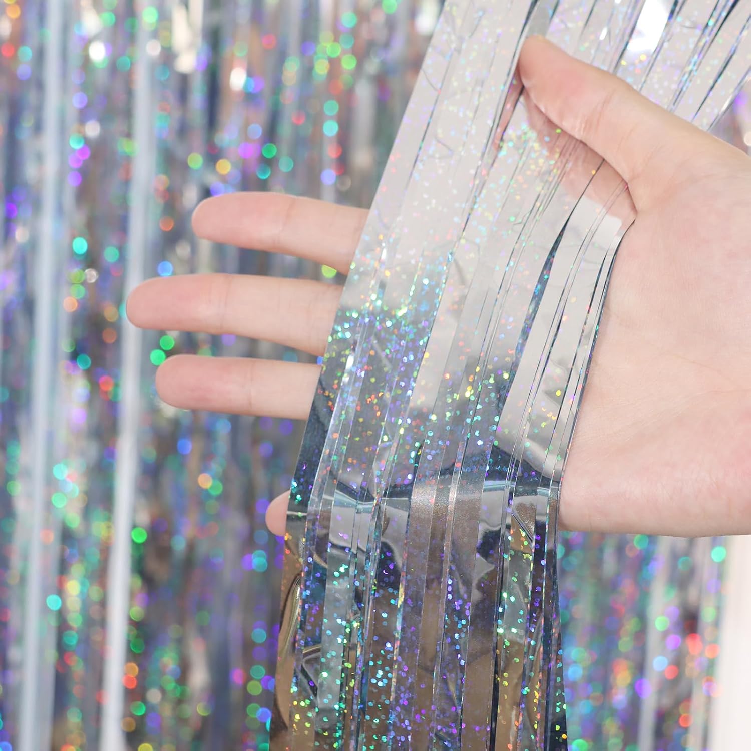 - Stunning Decorative Set: You'll receive 2 pcs laser silver foil fringe backdrop curtains, each measuring 3.28 ft (wide)×6.56 ft (drop). Enough length foil fringe curtains backdrops are perfect for the door or wall to create an impressive decoration