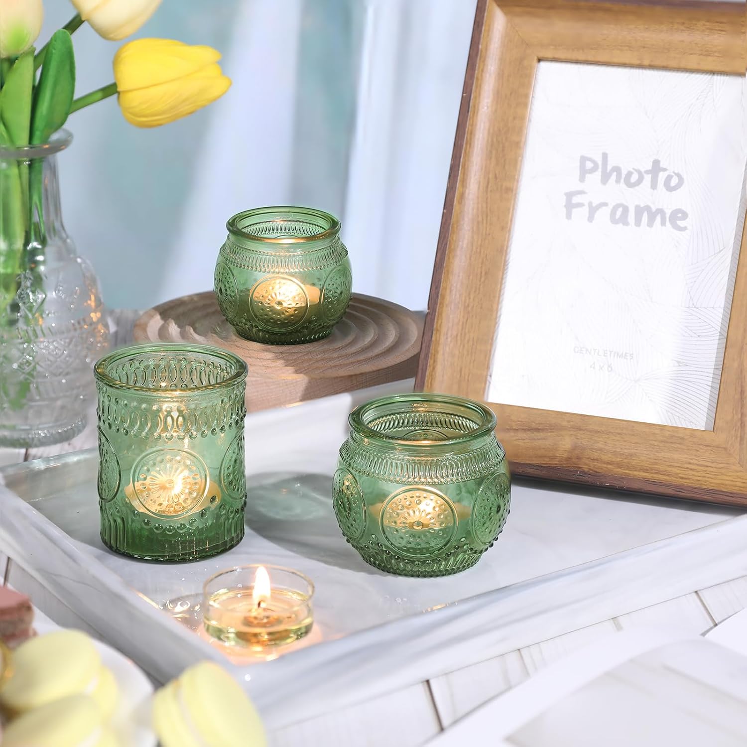 - [ Votive Candle Holders Set ]: You will get 12 pack green votive candle holders in your package, including 6 glass votives and 6 bowl glass votives.The dimensions are 2.1ʺD x 2.56ʺH and 2.1ʺD x 2.1ʺH approximately. These glass votive candle holders are the perfect complement to any dining table, which can be used with regular votive candles, tea light candles, flameless LED tea waxes, and edible butter candles, creating a warm and inviting ambiance that enhances the dining experience.