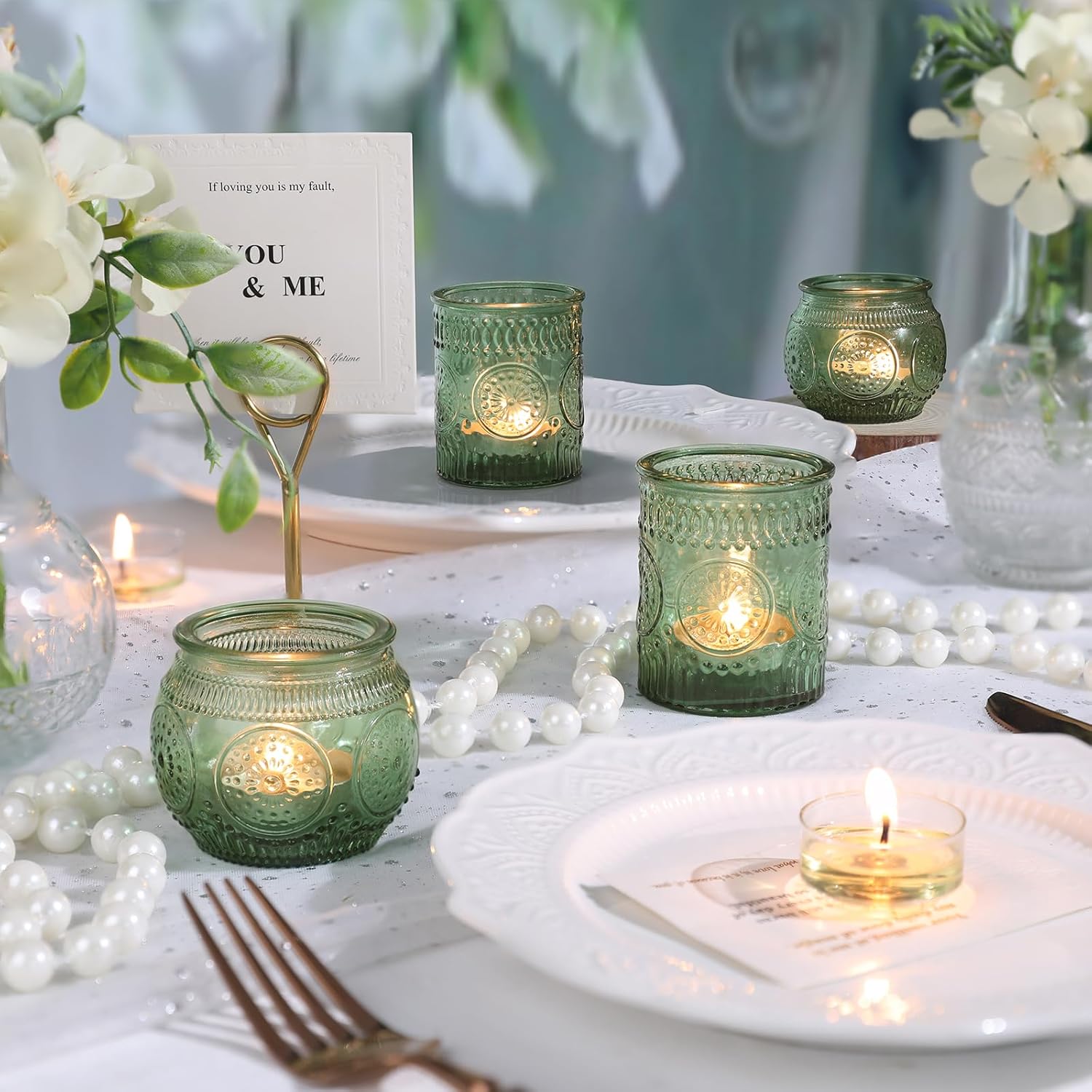 DARJEN 12Pcs Green Votive Candle Holders - Glass Tea Light Candle Holder for Wedding Shower, Candle Holder Bulks for Wedding & Home Table Decor, Vintage Parties Gifts