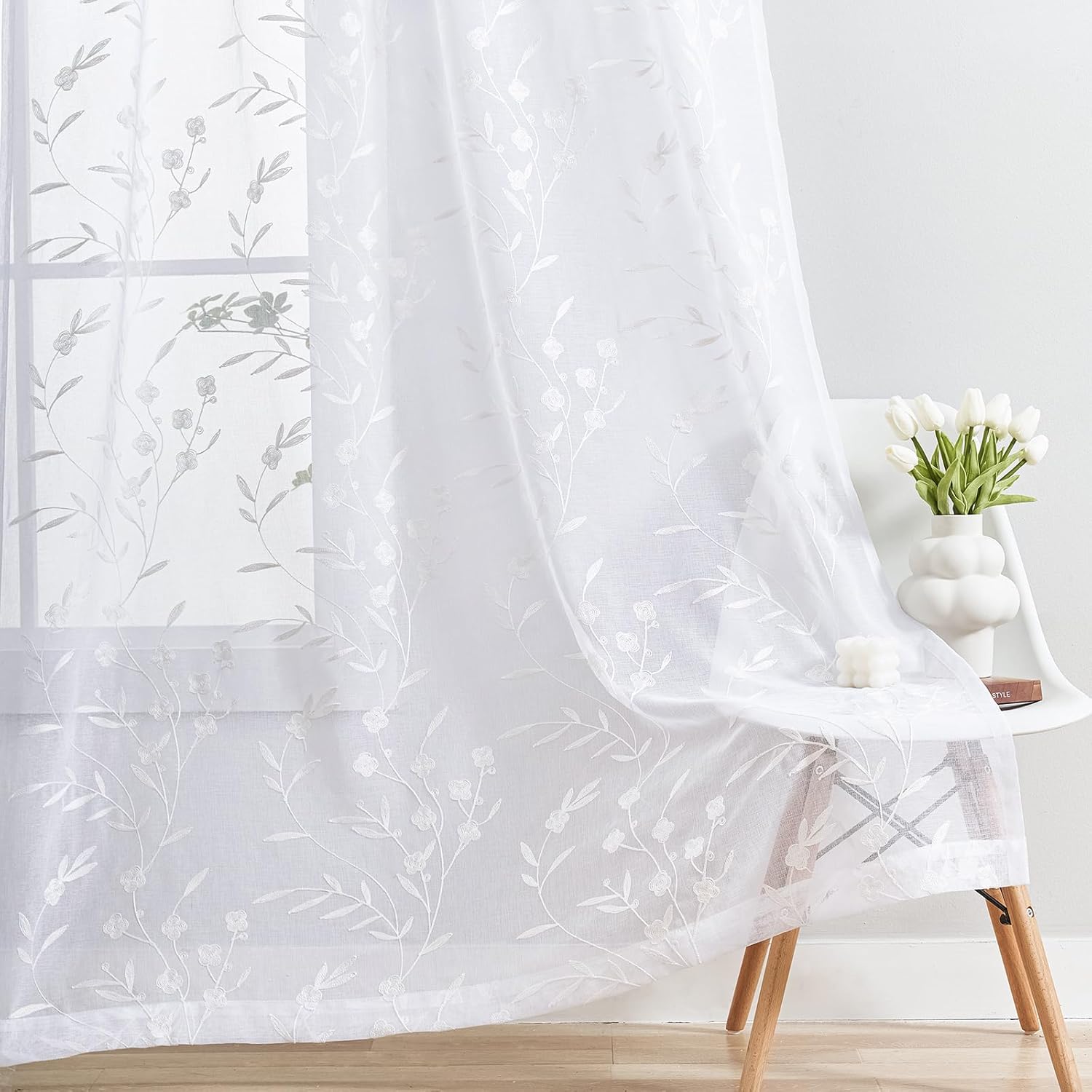 Sheer Curtains White 54 Inches Long Floral Embroidery Rod Pocket Voile Drapes for Living room, Bedroom, Window Treatments Semi Lace Outdoor Curtain Panels for Patio, Lawn, Garden, Set of 2, 52"x 54".