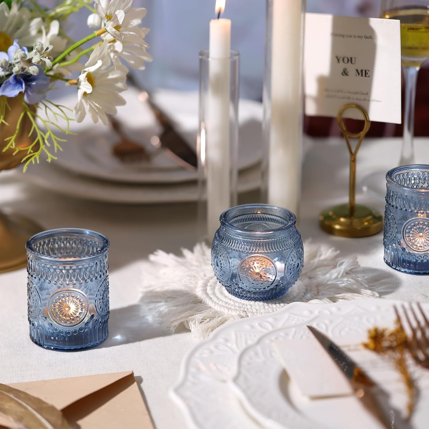 - ❤️❤️[ Votive Candle Holders Set ]❤️❤️: You will get 36 pack blue votive candle holders in your package, including 18 glass votives and 18 bowl glass votives.The dimensions are 2.1ʺD x 2.56ʺH and 2.1ʺD x 2.1ʺH approximately. These glass votive candle holders are the perfect complement to any dining table, which can be used with regular votive candles, tea light candles, flameless LED tea waxes, and edible butter candles, creating a warm and inviting ambiance that enhances the dining experience.