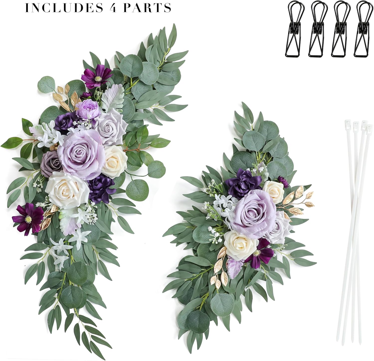 - 4. Easy to Install: Ready to use straight out of the box and easy to assemble. Comes with reusable detachable adjustable cable ties and metal clips for easy tying to any type of wedding sign, chair back, arch iron frame, wooden arch, etc.