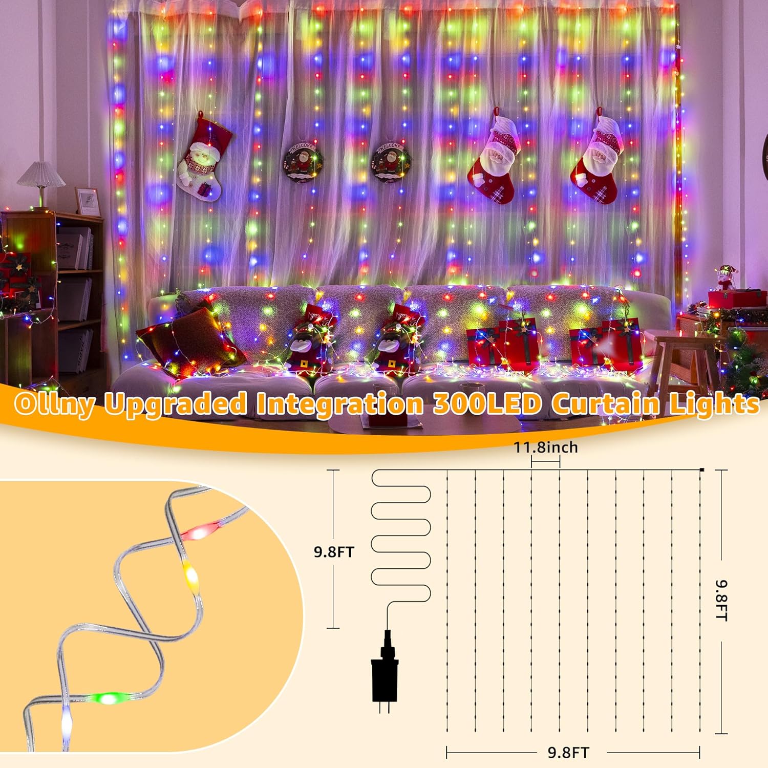 Ollny Curtain Lights 300 LED 9.8FT x 9.8FT, Connectable IP67 Waterproof Outdoor Christmas Curtain Lights with Remote, Plug-in Untangle Fairy Lights with 8 Modes&Timers for House Decor(Multicolored)