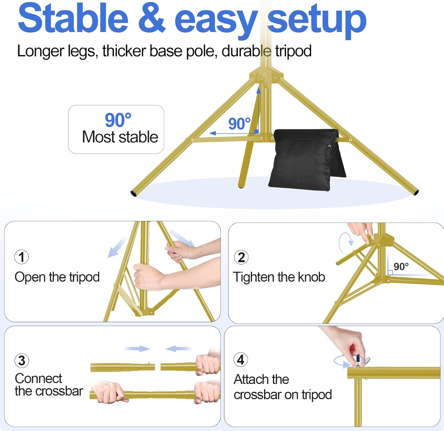 - 【Sturdy Tripod Backdrop Stand】 With adjustable height (2.6ft/0.8m–7.0ft/2.1m) , the aluminum alloy backdrop stand is durable, and the design of the tripod base ensures it won’t shake when fully extended to its maximum size.