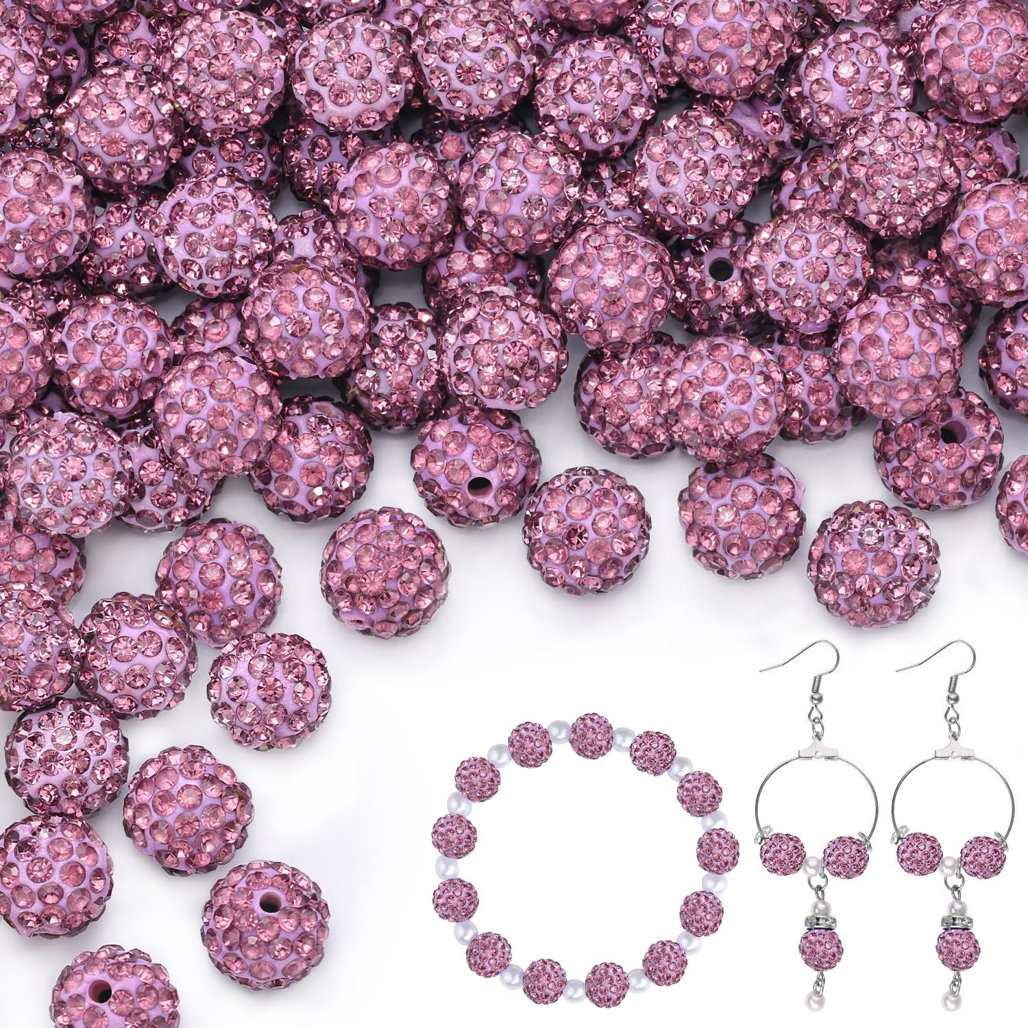 150pcs 10mm Rhinestone Beads for Jewelry Making, Light Purple Shiny Round Shamballa Disco Beads Bulk, Sparkle Crystal Clay Christmas for Bracelet Baseball Necklace Earring Crafting and DIY