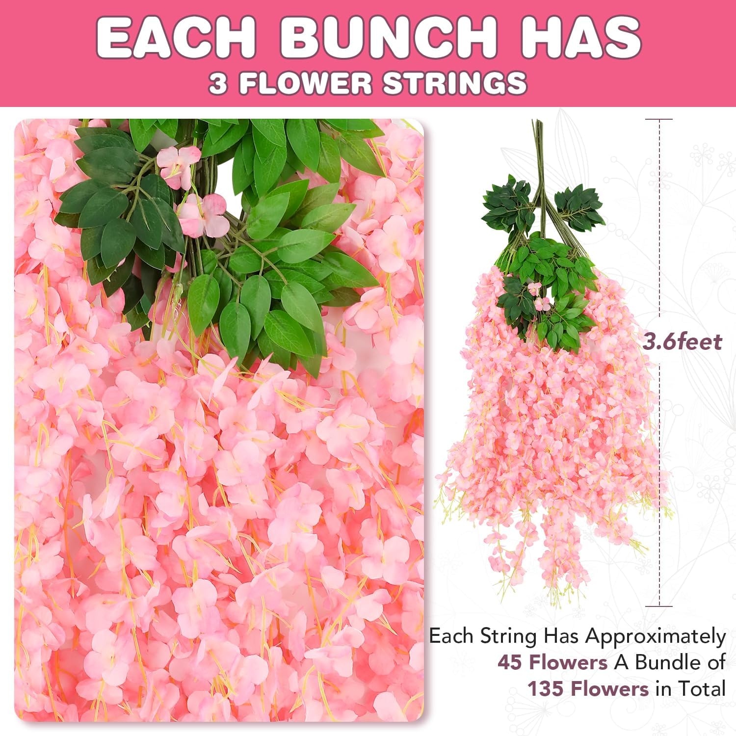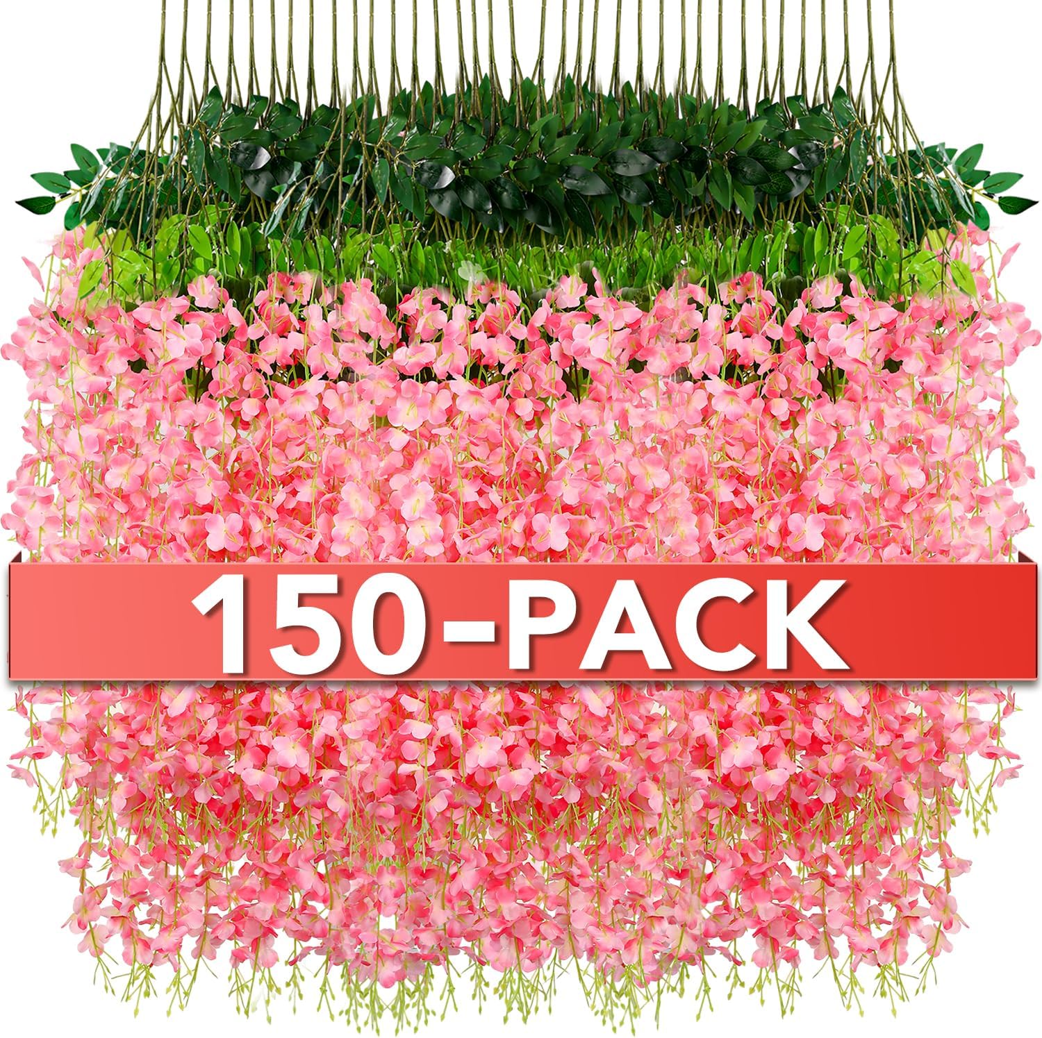 - Include Content:This package includes 150 pink artificial wisteria vines, measuring 3.6 feet in length. Each vine has three branches, measuring 23.6 inches in length. There are 29 pink wisteria flowers on each branch