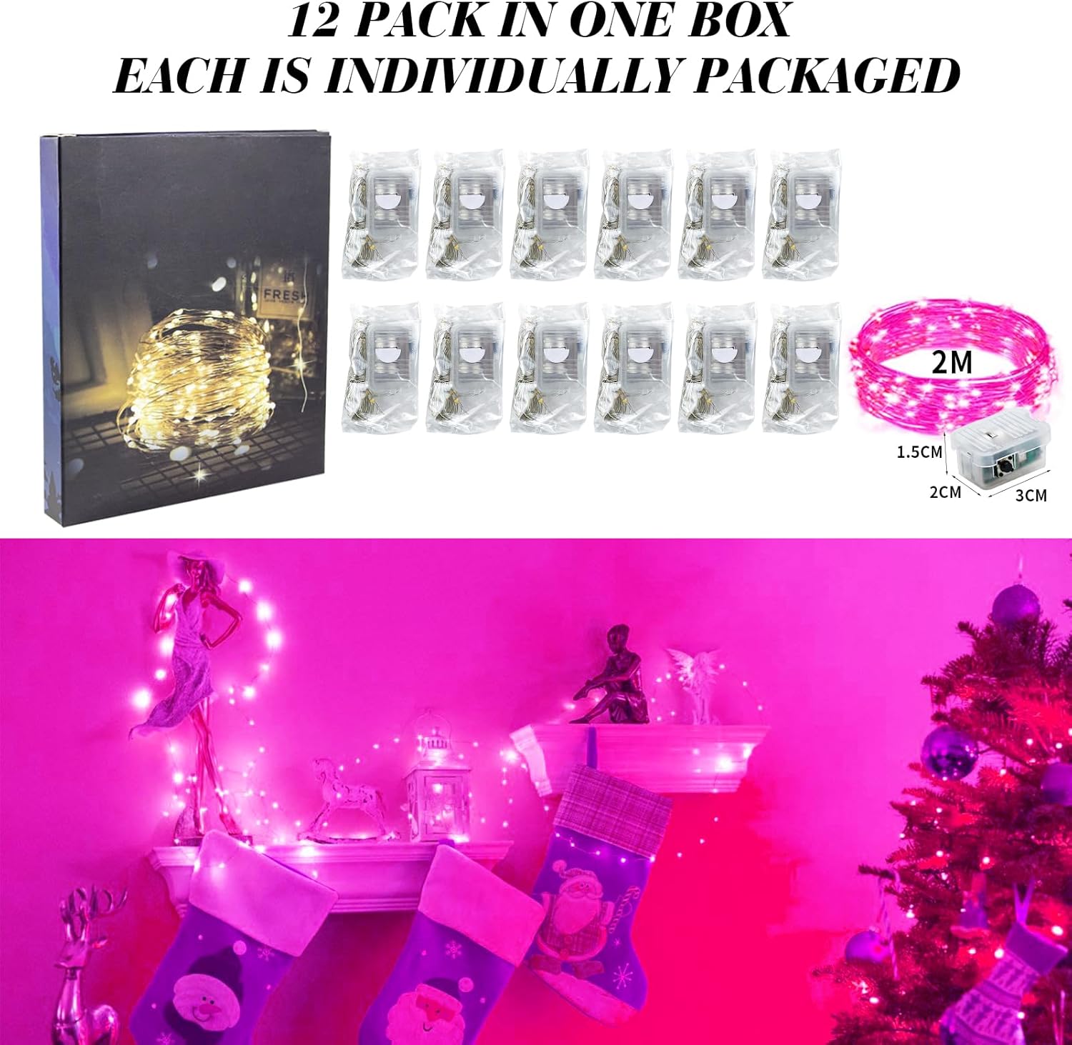 - IP65 WATERPROOF AND INDIVIDUALLY WRAP: The battery fairy lights are waterproof can be used for Indoor/Outdoor. (the battery pack is not waterproof) safe to the touch. Made of soft bendable wire so you can easily bend into any shape or wrapped it on anything such as Christmas trees, wine bottle, pumpkins, guirlande lumineuse interieure, potted landscape etc.Each light is individually packaged, say goodbye to cable tangles and bring more happiness and satisfaction to your family and friends