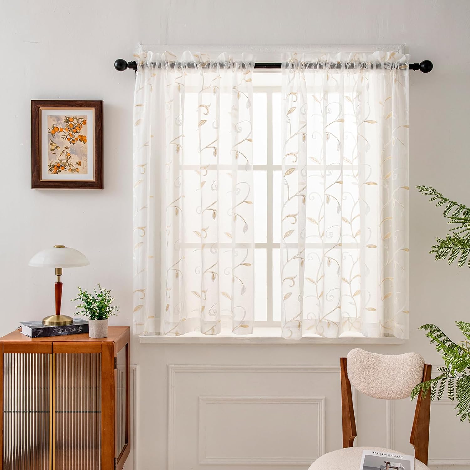 VISIONTEX Sheer Voile Curtains, Decorative Beige Leaves Embroidery Faux Linen Rod Pocket Window Drapes for Home Kitchen, Living Room and Bedroom 54 x 54 Inch, Set of 2 Curtain Panels