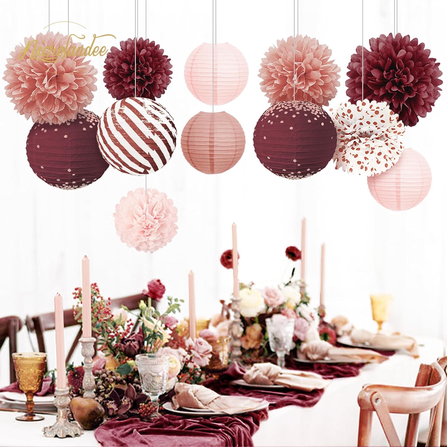 - Perfect for Any Celebration – This tissue pom poms and paper lanterns combo adds elegance to wedding party decorations, birthday party setups, retirement party backdrops, baby showers, and more. The rich burgundy, blush pink, and rose gold hues create a warm, festive atmosphere