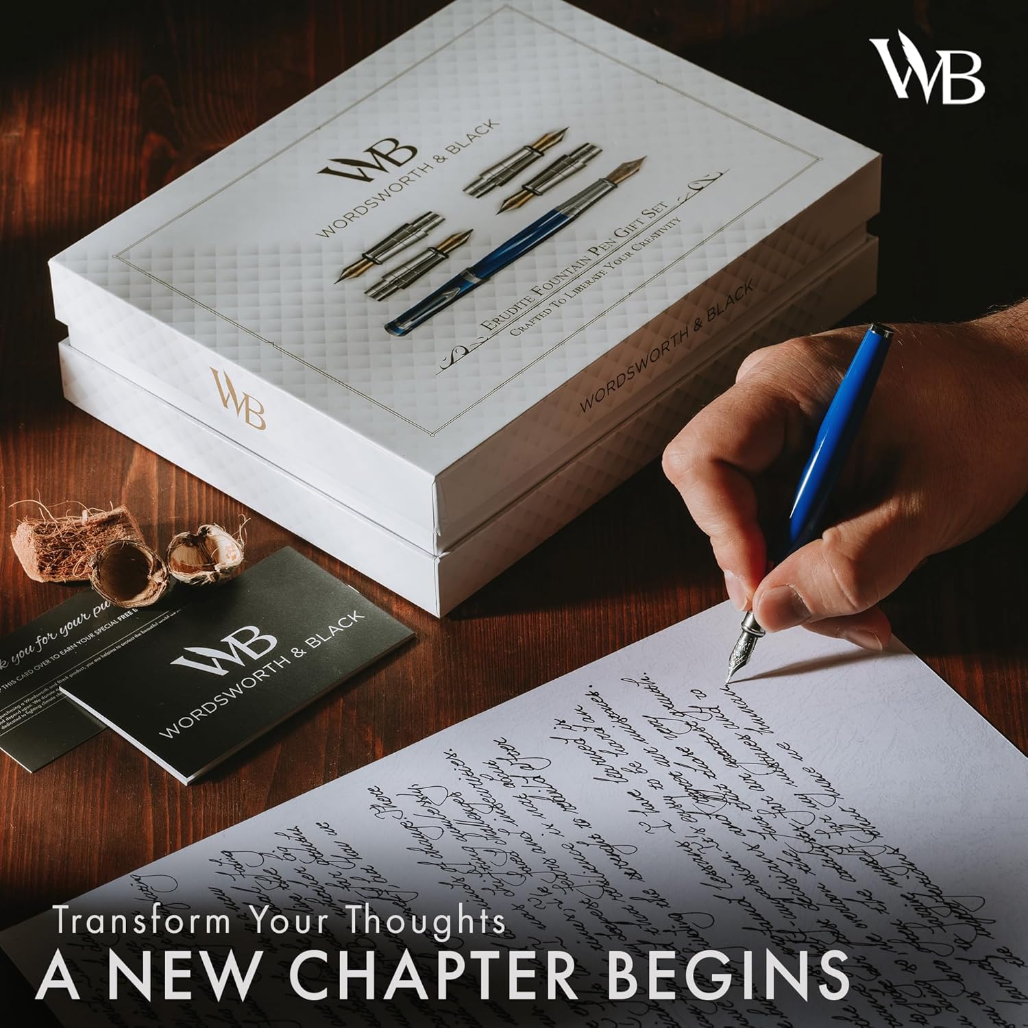 Wordsworth & Black Fountain Pen Gift Set, Includes Bottle, 6 Cartridges, Refill Converter, 4 Replacement Nibs, Premium Package, Journaling, Calligraphy, Smooth Writing Pens [Blue Chrome]
