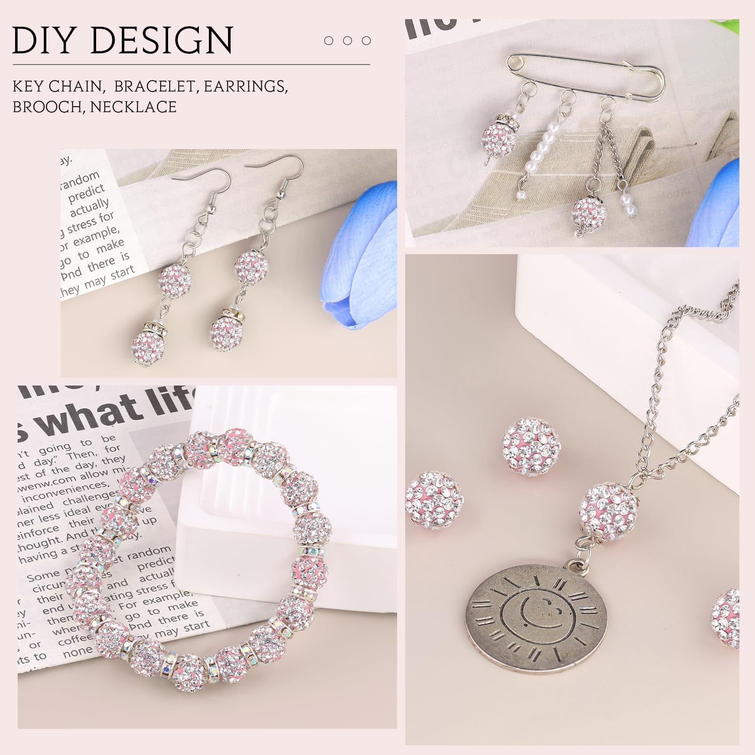 100pcs 10mm Rhinestone Beads for Jewelry Making, Pink White Shiny Round Shamballa Disco Ball Beads Bulk, Sparkle Crystal Clay Christmas for Bracelet Baseball Necklace Earring Crafting and DIY