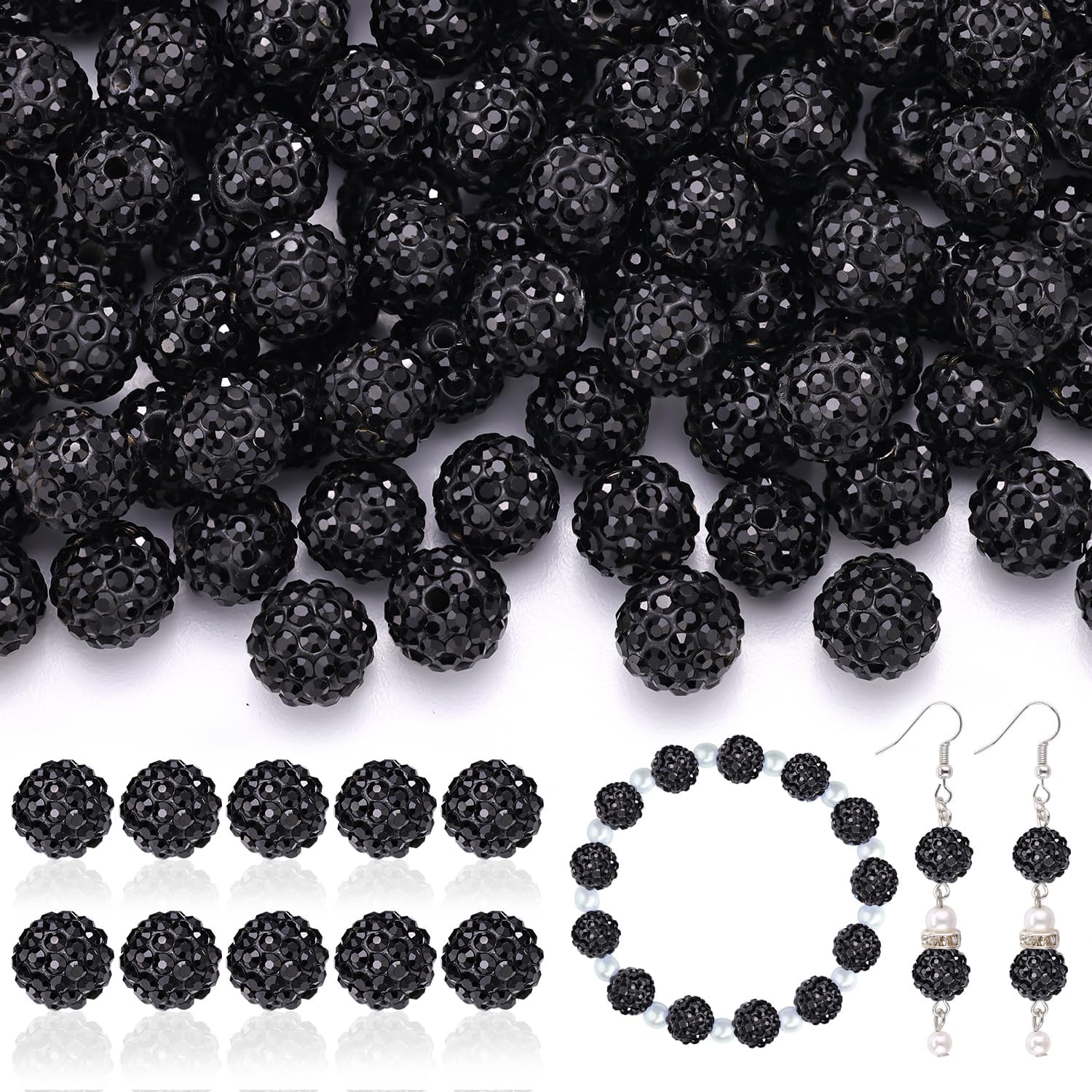 160pcs 10mm Rhinestone Beads for Jewelry Making, Black Shiny Round Disco Ball Beads Bulk, Sparkle Crystal Clay Christmas for Bracelet Baseball Necklace Earring Crafting and DIY
