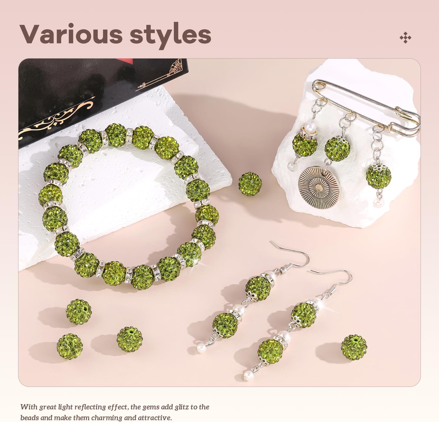 - BLING EFFECT -- Our rhinestone beads are made of polymer clay, embedded with superior quality glass rhinestones. We do quality control management to ensure the high quality of the bling beads. Rhinestones cover the entire surface and are not easy to fall off, shining like a diamond. With great light reflecting effect, the gems add glitz to the beads and make them charming and eye-catching. Wearing ornaments made from these beads, you will be the center of attention.