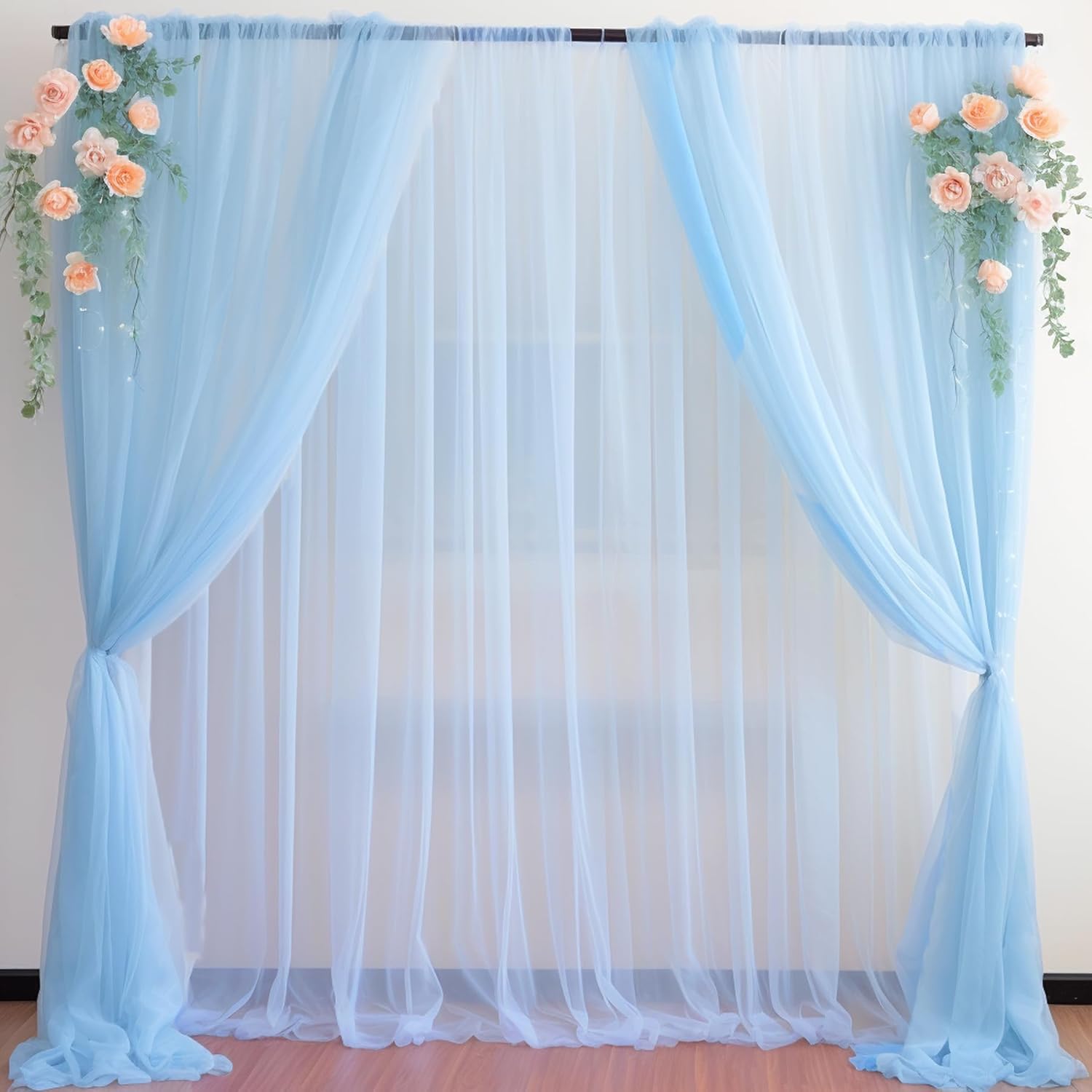 - 【Multiple Use Sheer Curtains】Our baby blue drapes for backdrop are applicable for any indoor and outdoor occasions. Perfect for wedding arch draping fabric, wedding reception decorations, birthday party curtains, bridal and baby showers, birthdays, candy buffet curtain, dessert table background, trade shows, wedding stage photography, photo booths, ceremony and more.