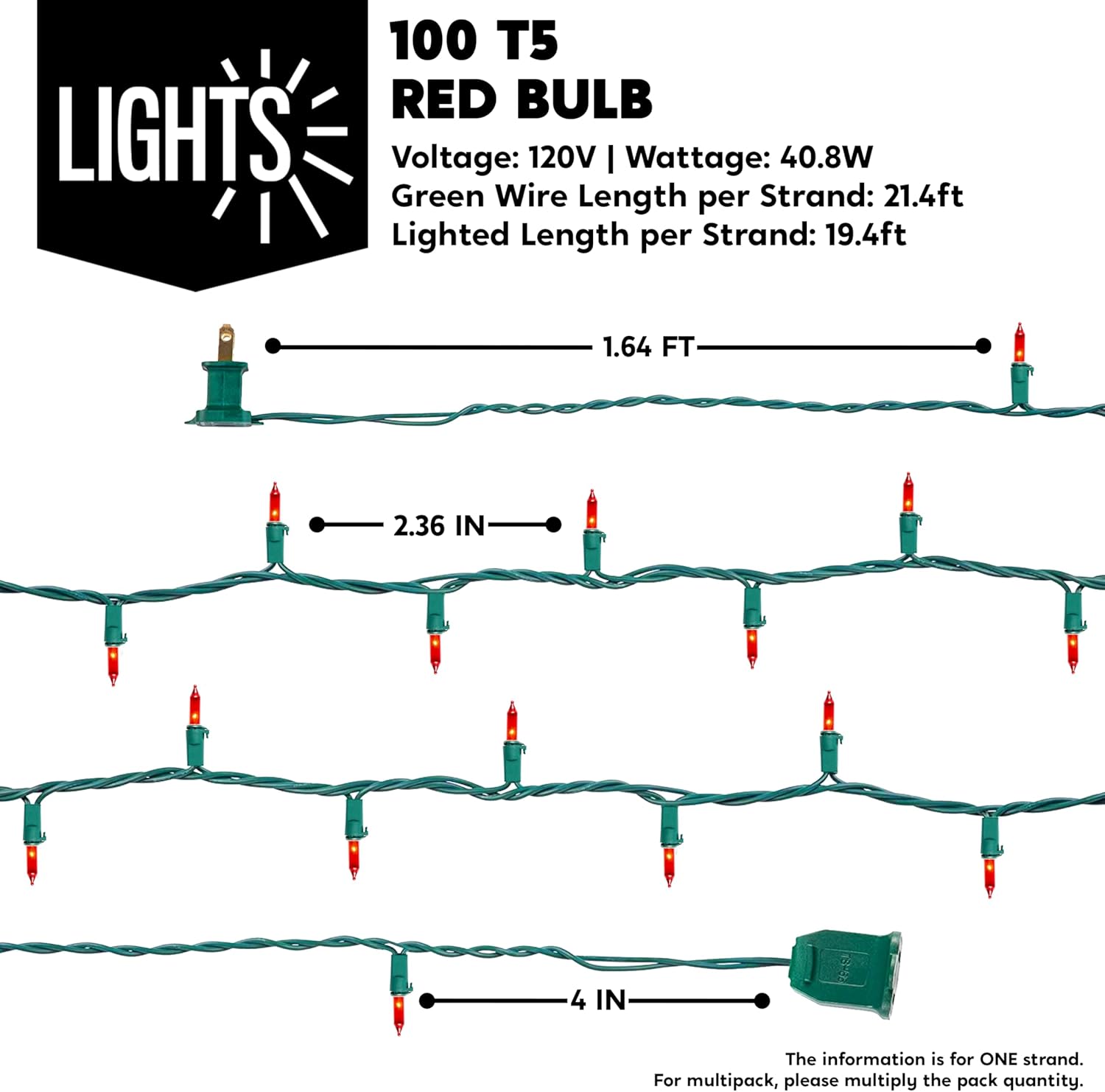 - Super Value Pack. Our Halloween incandescent string lights have a total of 100 incandescent red T5 bulbs with green wire. 40.8W 120V. Total Lighted Length is 19.4 Feet. Total Wired Length is 21.4 Feet. Bulb Spacing 2.36 inches. High Voltage.