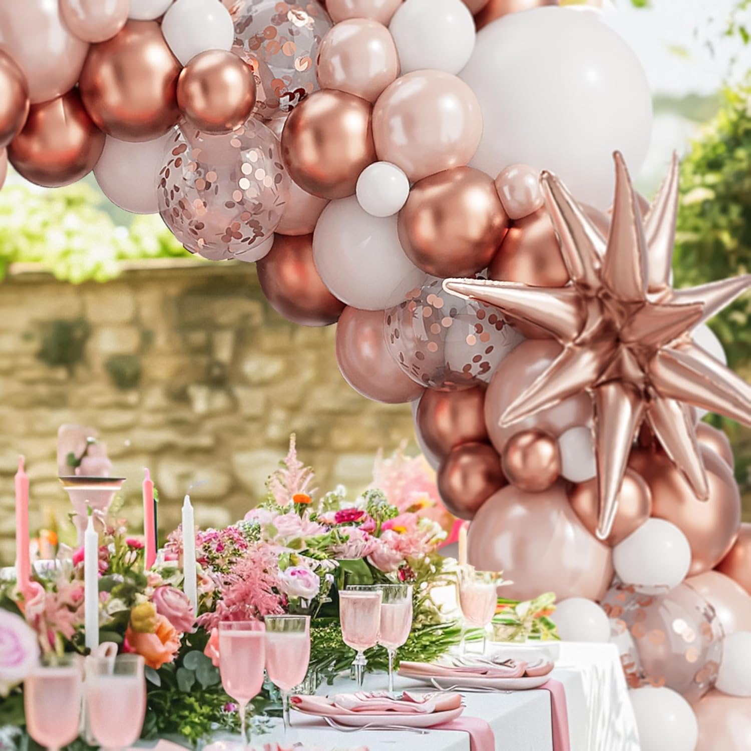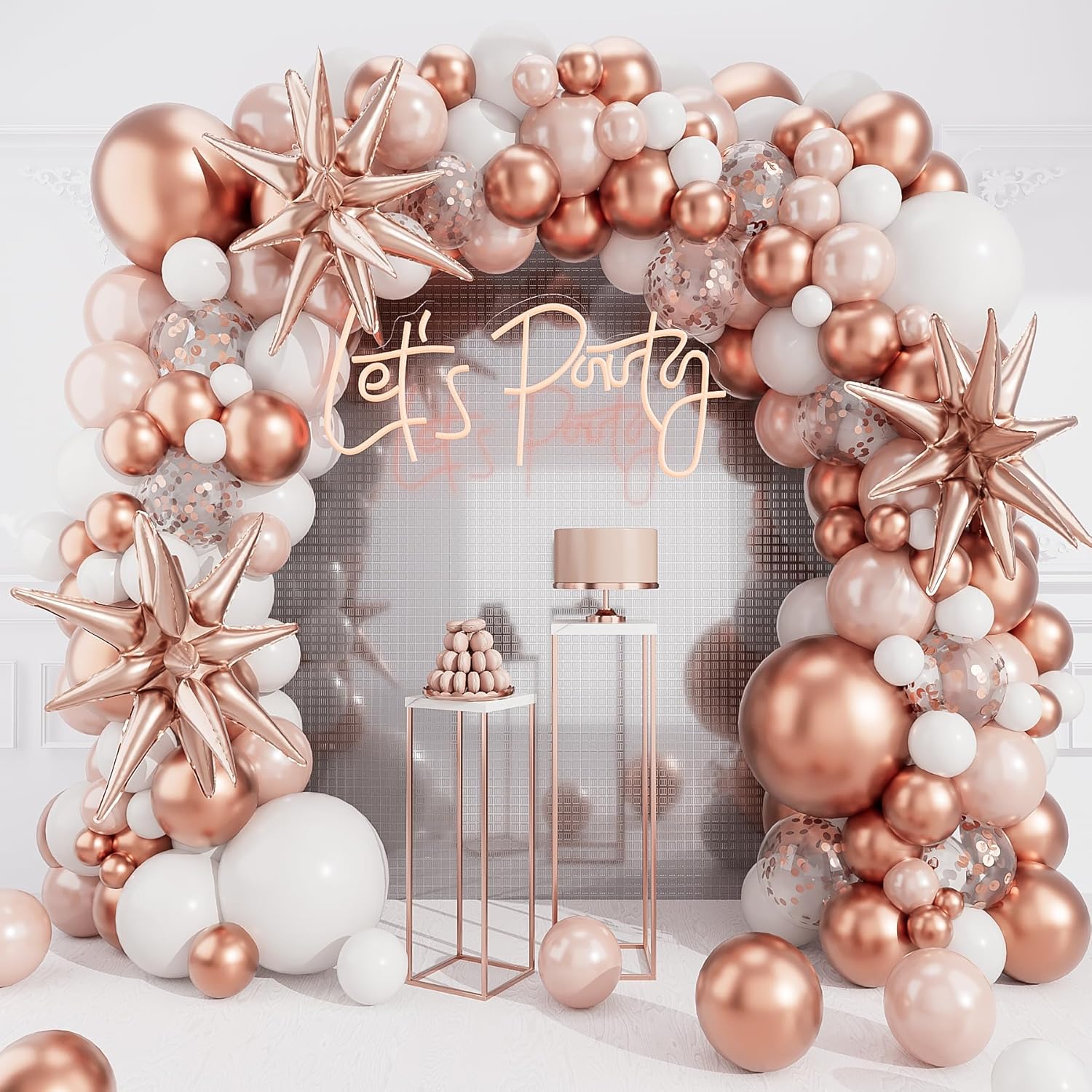- 【Package Include】- The rose gold balloon arch kit includes rose gold starburst balloons 22”3pcs,metallic rose gold balloons(18”2pcs+12”5pcs+10”30pcs+5”20pcs),white balloons(18”2pcs+10”30pcs+5”10pcs),pearl rose gold balloons(10”20pcs+5”10pcs),rose gold confetti balloons 12”10pcs,balloon glue dot;balloon decorating strip.