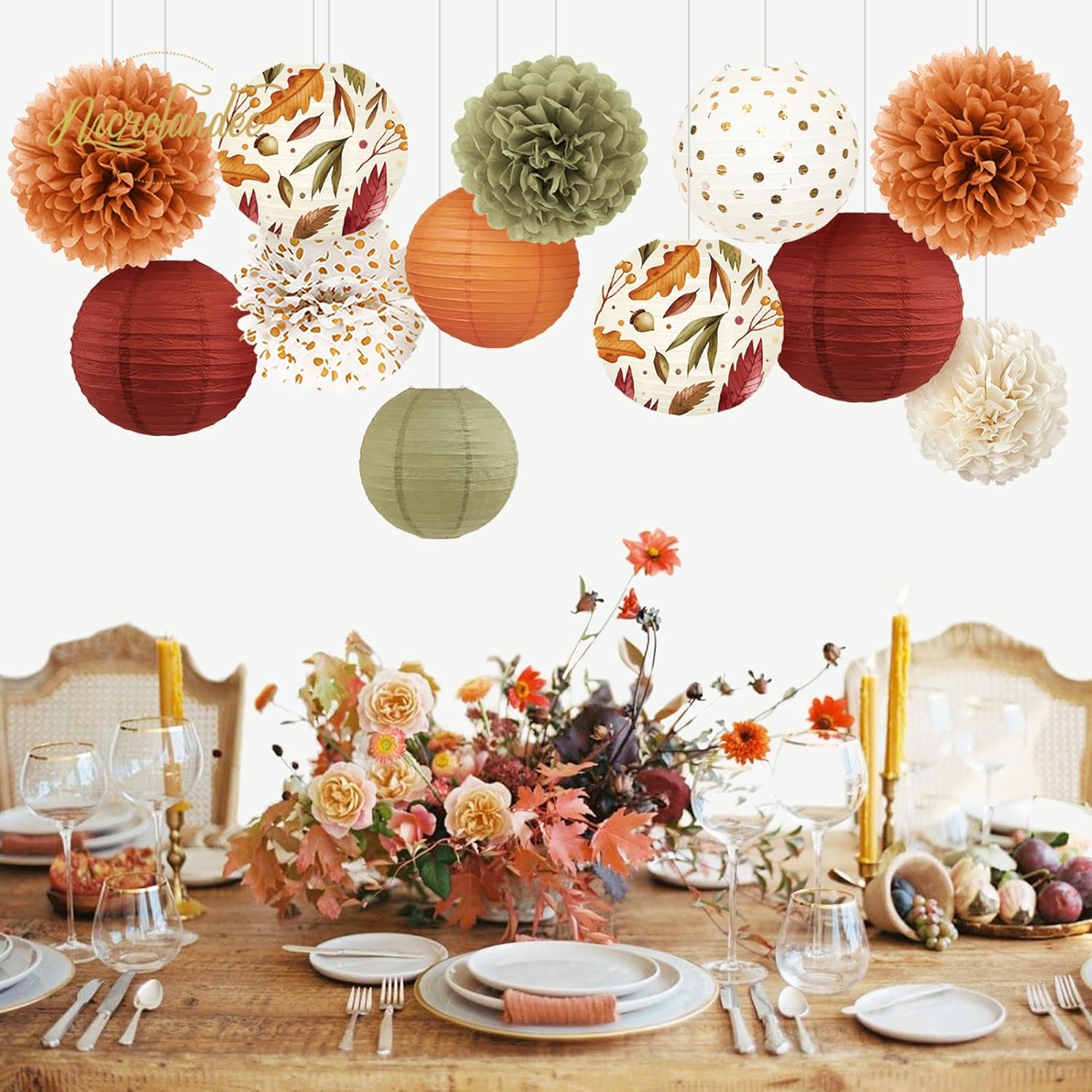 NICROLANDEE Fall Wedding Decorations, 12 PCS Orange Maple Leaf Paper Lanterns Tissue Pom Poms for Thanksgiving Day Backdrop Decoration, Fall Baby Bridal Shower, Birthday, Autumn Harvest Party Decor