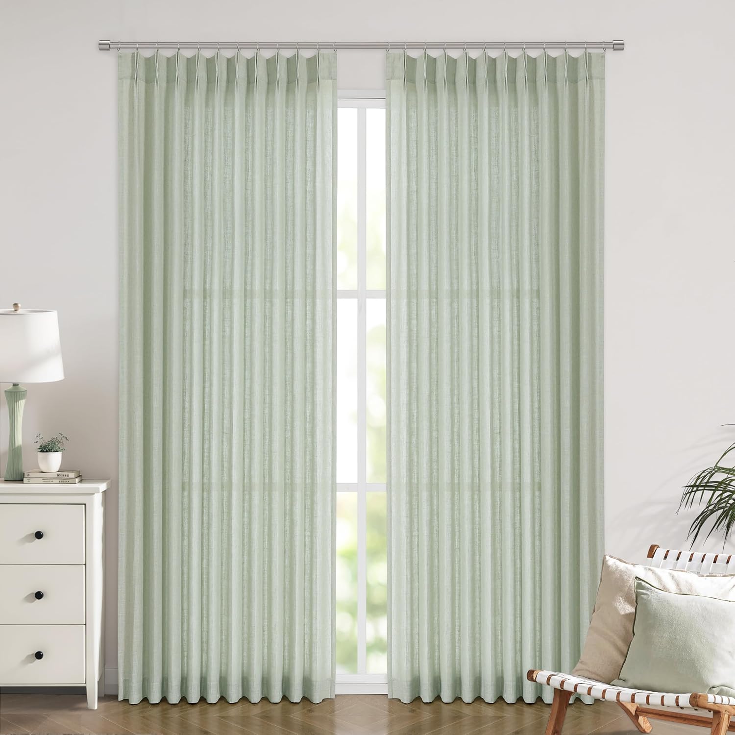 Vision Home Light Green Pinch Pleated Semi Sheer Curtains Textured Linen Blended Light Filtering Window Curtains 90 inch for Living Room Bedroom Patio Pinch Pleat Drapes with Hooks 1 Panel 60" Wx90 L
