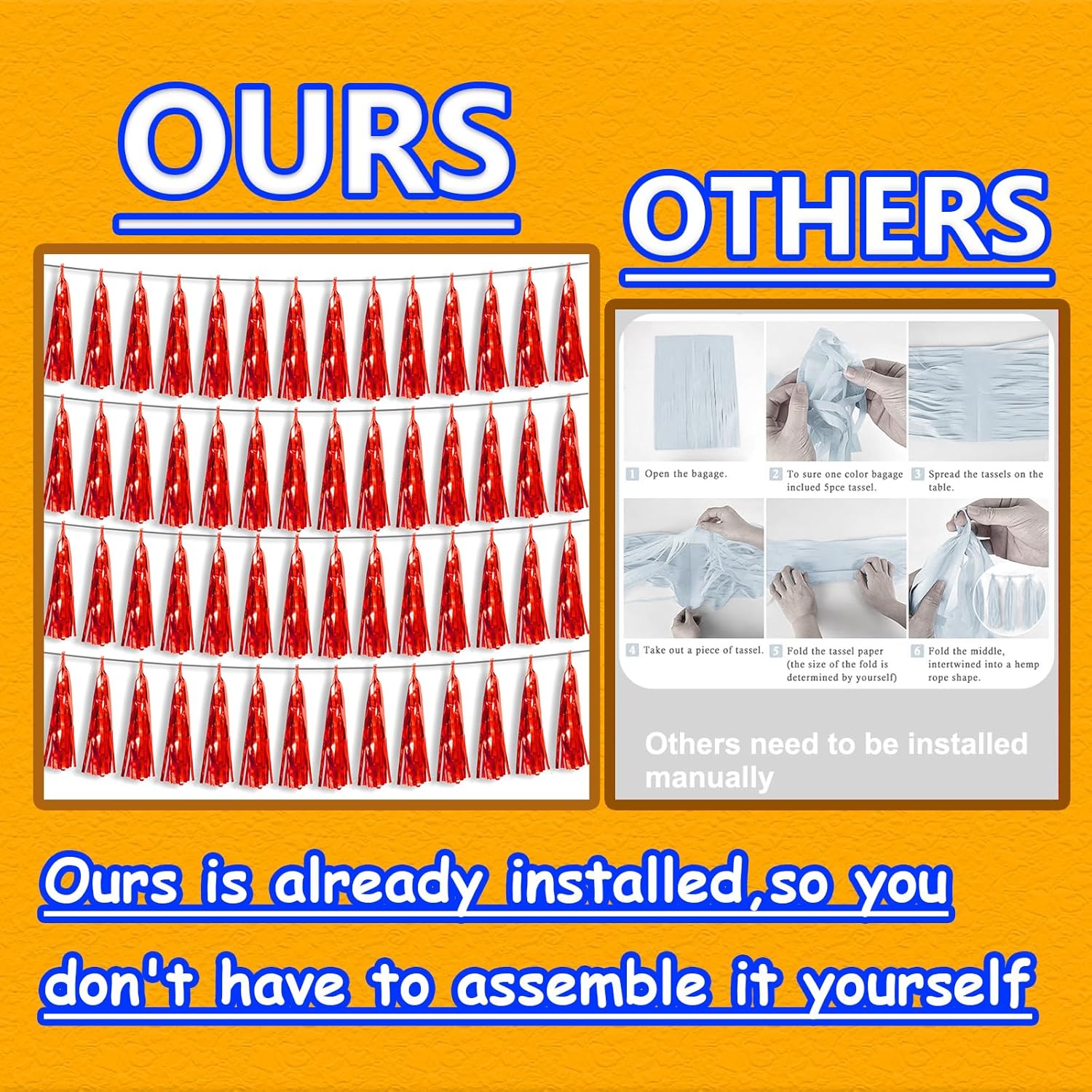 - 【Package Includes】The total length of the red birthday tassels banner is 40 feet, divided into 4 strips, each 10 feet long. Each banner contains 15 tassels, and each tassel measures 14 inches, for birthday decorations many occasions uitable for Patriotic display, Homecoming Float, Christmas Float, ecorative metal trailers, graduation floats etc