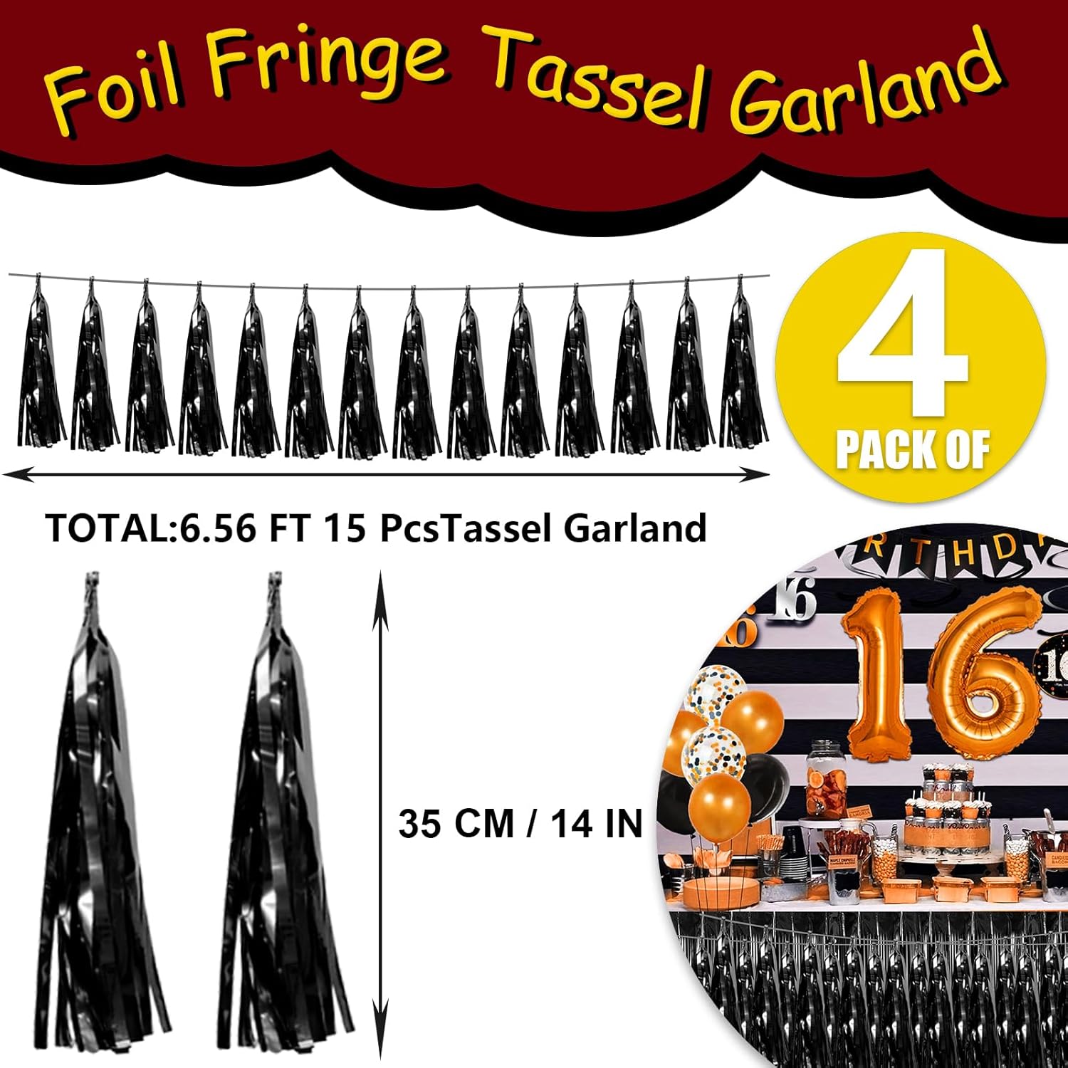 - 【Package Includes】The total length of the black birthday tassels banner is 40 feet, divided into 4 strips, each 10 feet long. Each banner contains 15 tassels, and each tassel measures 14 inches, for birthday decorations many occasions uitable for Patriotic display, Homecoming Float, Christmas Float, ecorative metal trailers, graduation floats etc