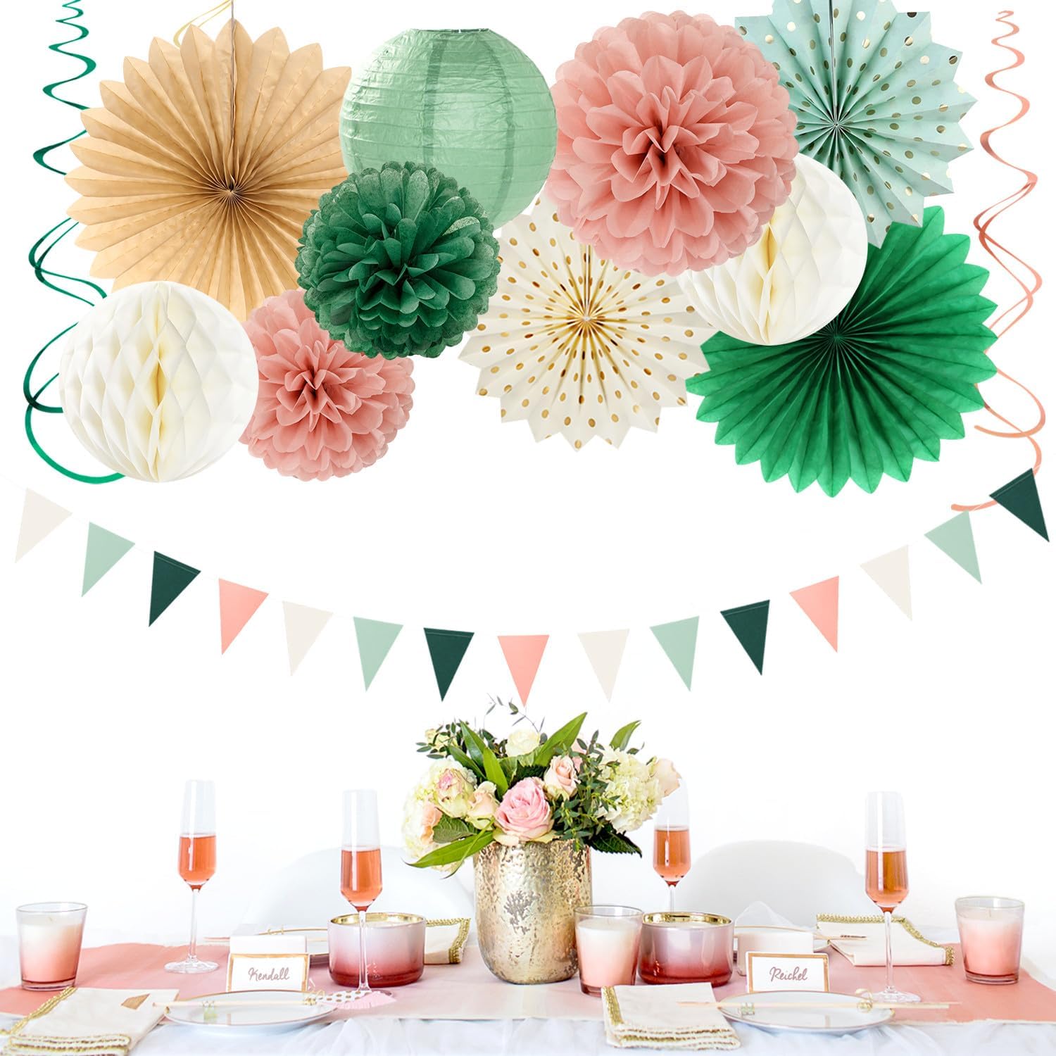 - 【Sage Green Pink Party Decorations Kit Includes】The party decorations kits include 9pcs tissue paper flowers: 3pcs 8" and 3pcs 10" and 3pcs 12" in sage green pink color, 4pcs 8inch paper lanterns,4pcs 12" paper fan,2pcs 8" paper homoneycomb and banner.