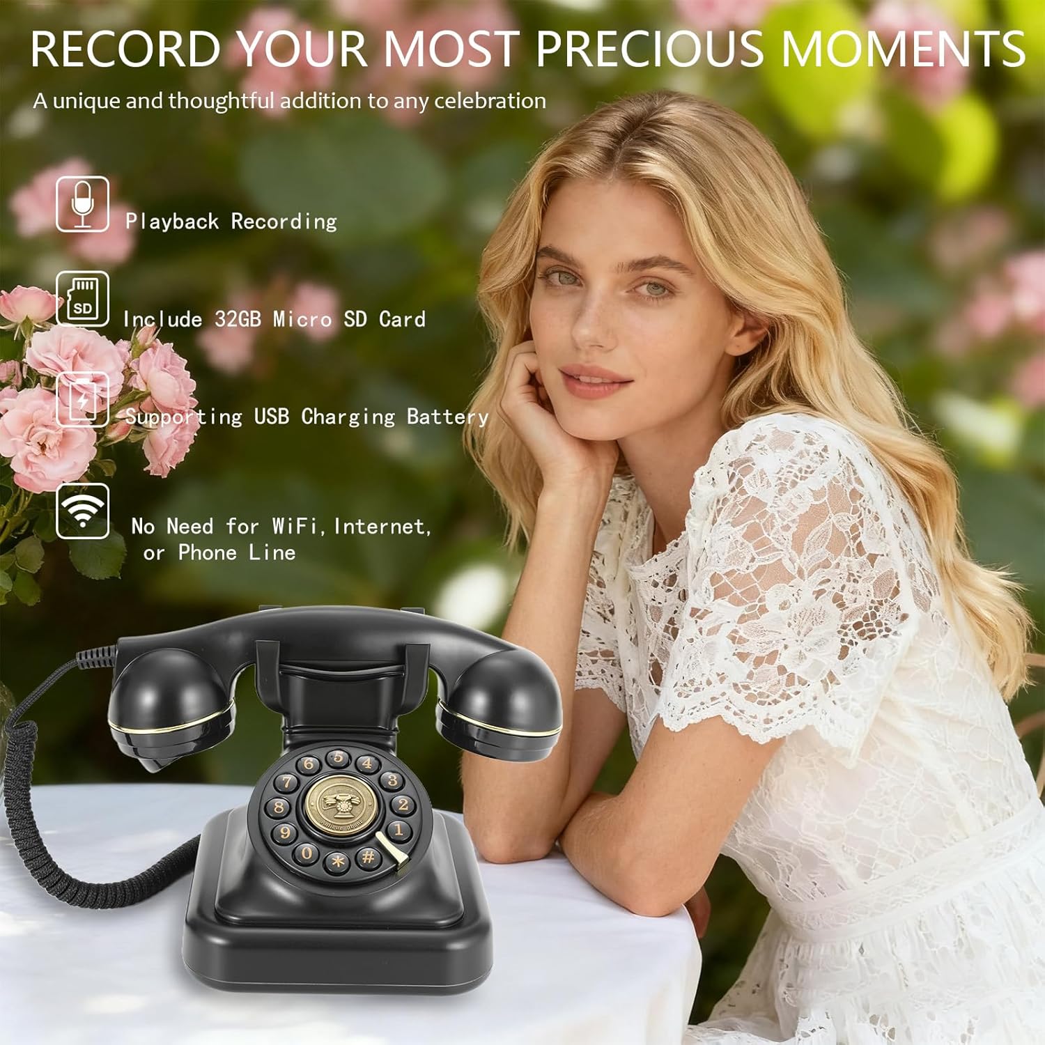 - Retro Guestbook For Wedding Design - Turn your audio guestbook into a unique experience. This vintage phone recorder transforms traditional written notes into meaningful audio keepsakes. Its charming retro design doubles as elegant wedding décor or party decoration, instantly catching guests’ attention while adding style to your event.