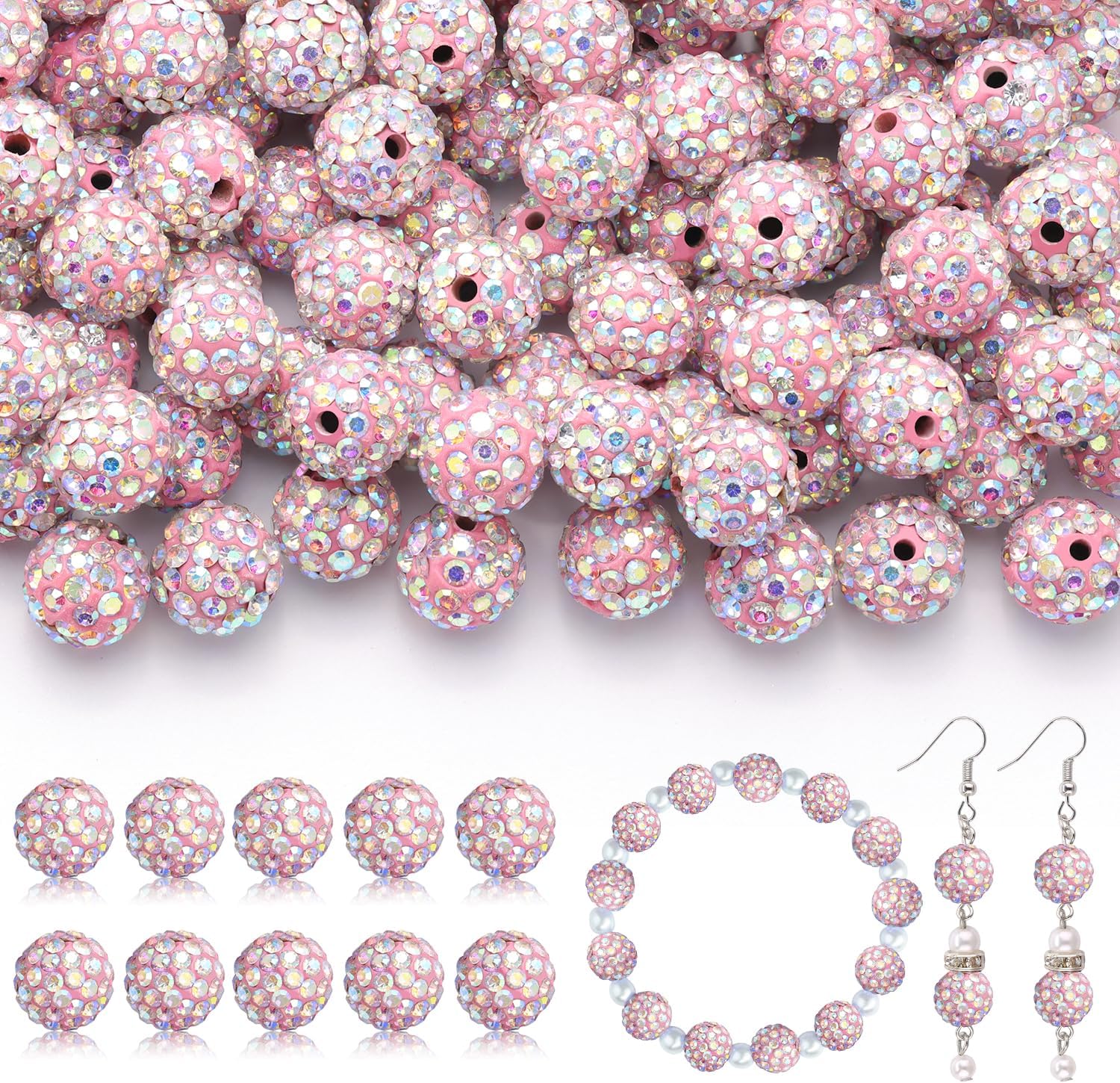 105pcs 10mm Rhinestone Beads for Jewelry Making, Pink AB Shiny Round Disco Ball Beads Bulk, Sparkle Crystal Clay Christmas for Bracelet Baseball Necklace Earring Crafting and DIY