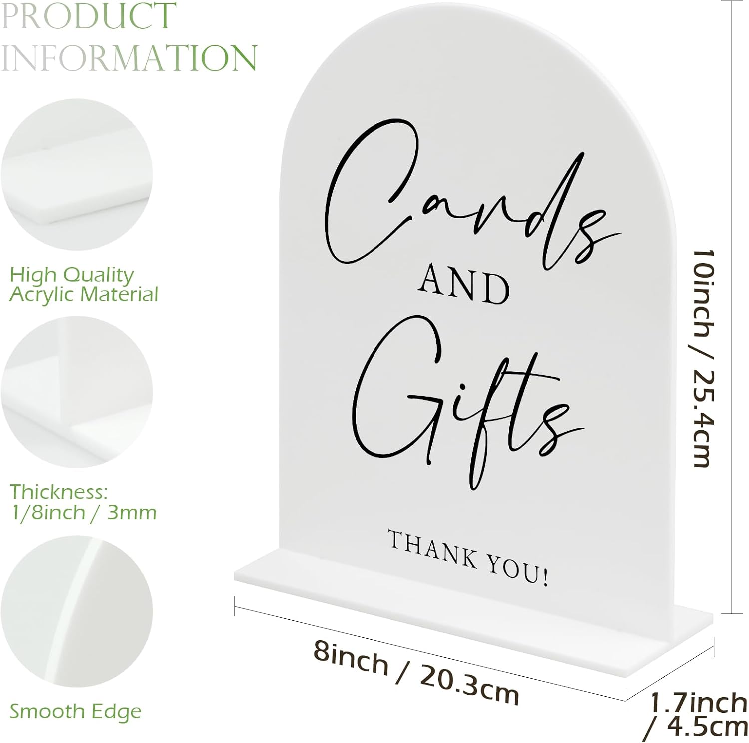 - Size: White Arch Acrylic Gift Table Sign -8x10 inches and 1/8" thick, Acrylic Stands- 8 x 1.8 inches.