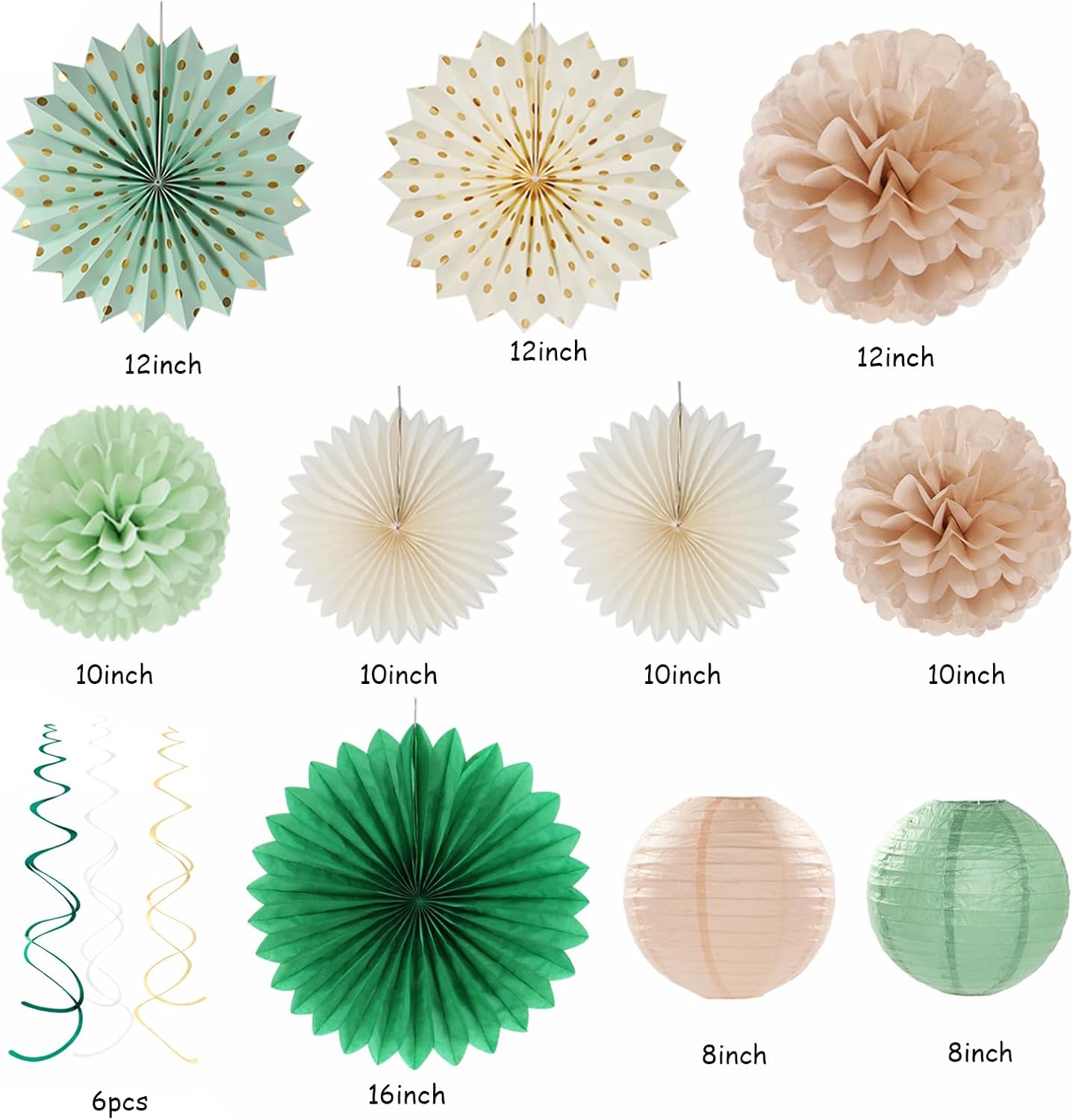 - Package Including:The olive sage green beige champagne gold ivory party decorations 1pcs paper garland dots,1pcs Triangle Flags in three color,15pcs tassel garland in four color,2pcs 8” paper lantern,6pcs streamers in three color,2pcs 10” paper lantern fan,2pcs 10” honeycomb ball in two color,1pcs 12”paper lantern fan,1pcs 12” honeycomb ball,1pcs 16”paper lantern fan.