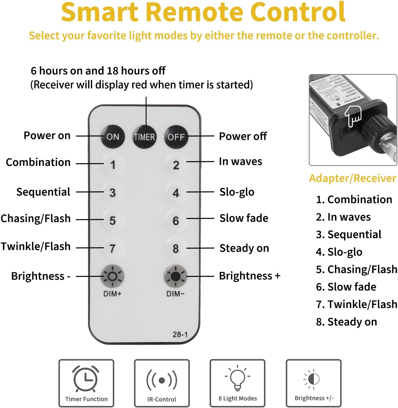 - Modes & Memory Function - The string lights have 8 lighting modes: Combination, in waves, sequential, slogs, chasing, slow fade, twinkle, steady on. With a memory function, the mode that is turned on again after being turned off is that before turning off.