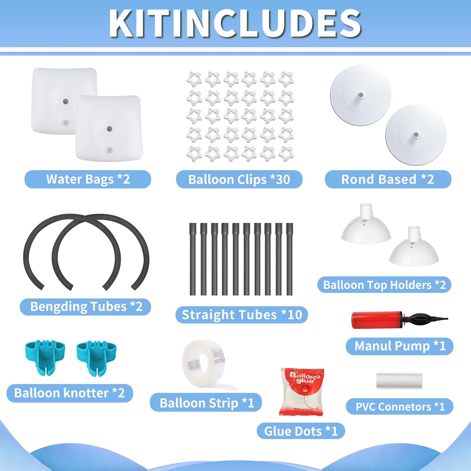 - 【All-in-One Kit】Our balloon arch kit includes everything you need: 10 straight poles, 2 bendable top poles, 2 round bases, 2 water/sand bags, 30 balloon clips, 2 balloon top supports, 2 balloon knotters, 1 roll of glue dots, 1 balloon arch strip, 1 PVC connector, 1 manual pump, and detailed instructions.