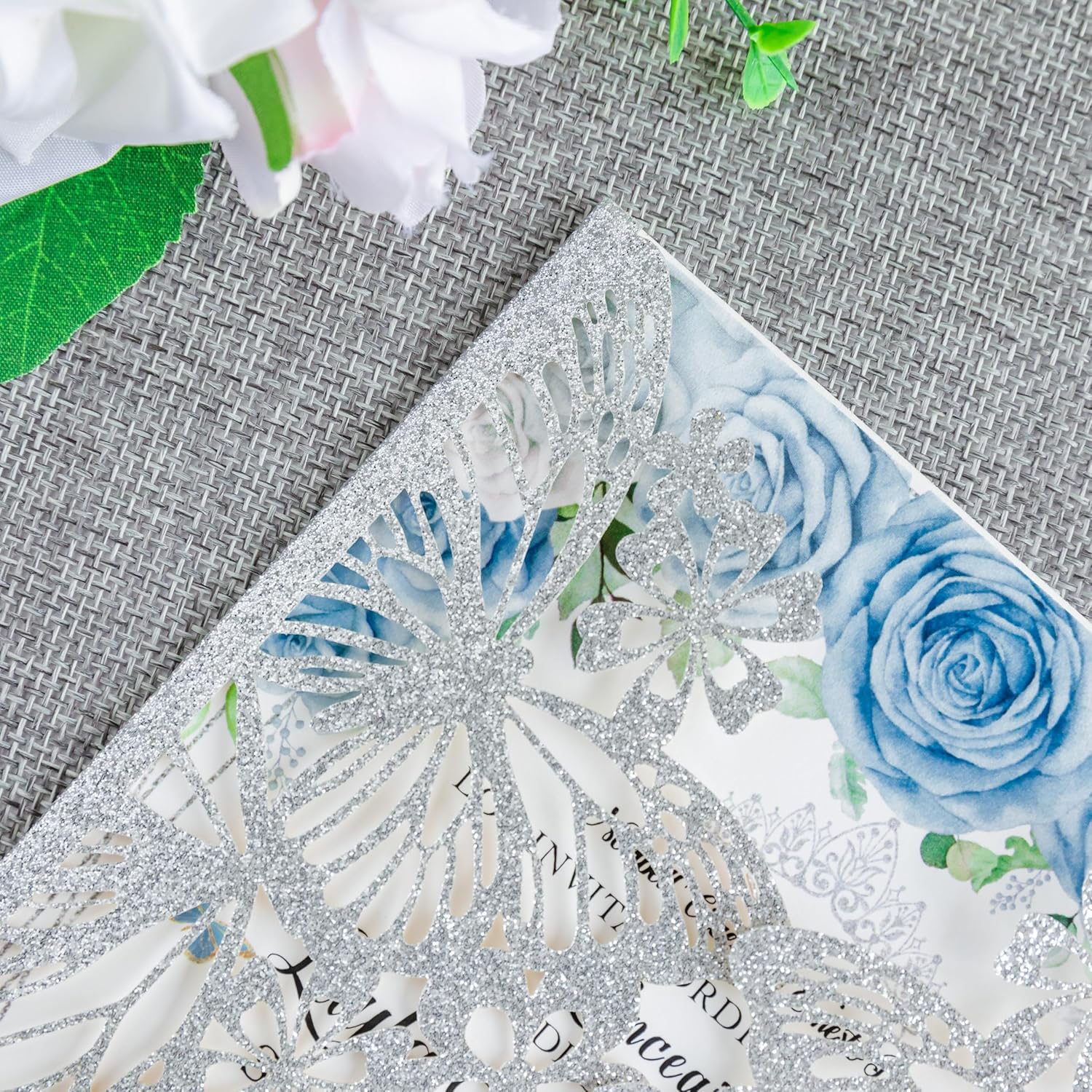 20 PCS 5.12x7.2 Butterfly Quinceanera Invitation, Laser Cut Wedding Invitation Cards with Envelopes for XV Anos Bridal Shower Baby Shower Invite (Silver Glitter)