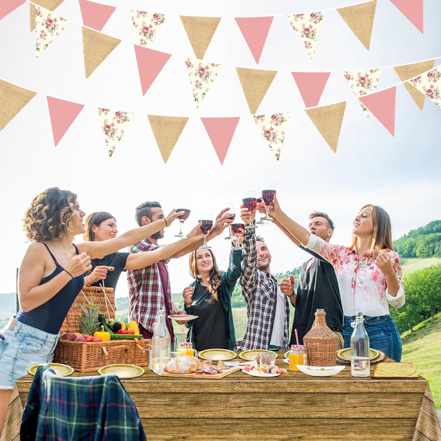 - Material: Longlife-hand-made blush pink and vintage flora printed burlap pennant banner made of strong weatherproof cotton and jute burlap. Washable and reusable for many times, soft and comfortable touch.