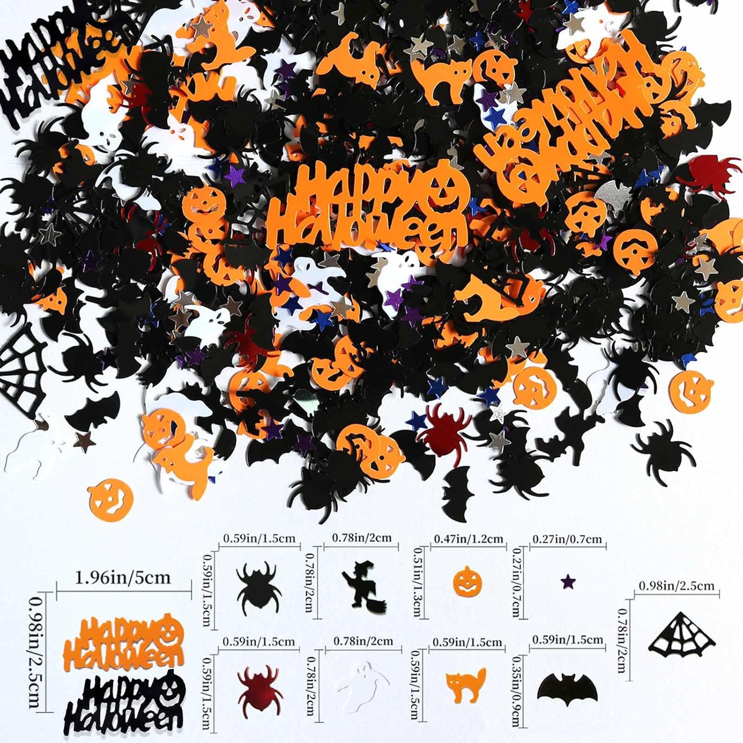 - 🎃 【Halloween Confetti Decorations】 This Halloween confetti comes in 5 colors: black, orange, purple, white,red. Includes: "Happy Halloween" confetti, pumpkin confetti, spider confetti, bat confetti. spider webs decorations.It's suitable for your Halloween party table decor, cute Halloween themed designs,full of festival atmosphere