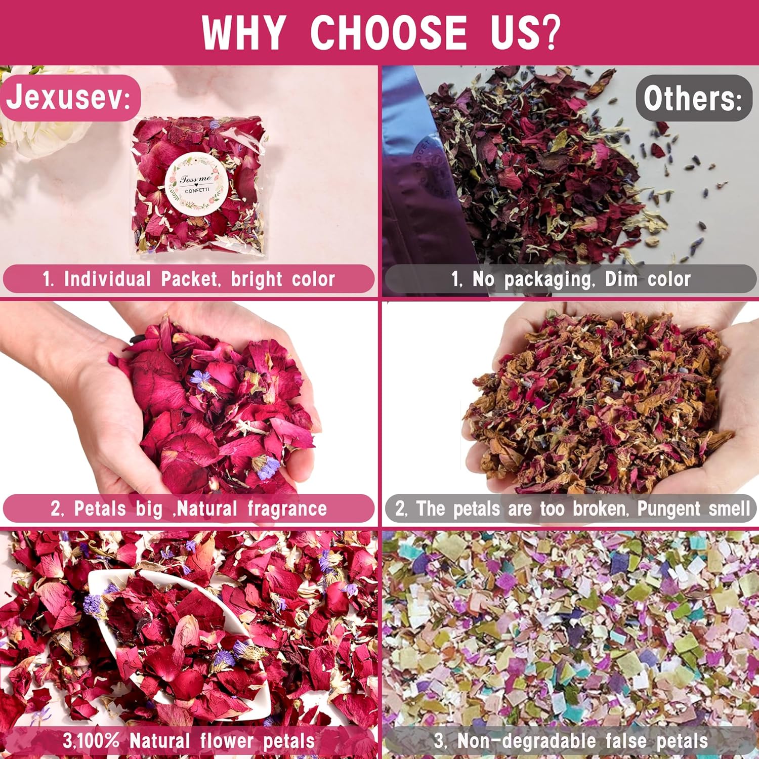 - ADD ROMANTIC MOMENTS: One of the most cherished traditions of a wedding is the joyful throwing of confetti or flower petals to celebrate the newlyweds.With our all-natural, eco-friendly dried flower confetti, you can add color to your wedding album.