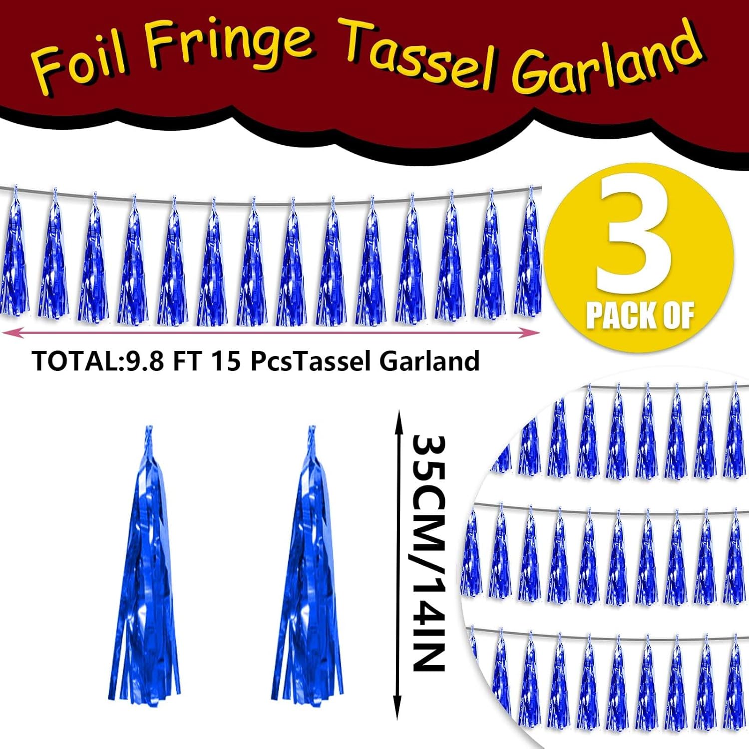 3P Metallic Fringe Tassel Banner Garland Foil Tinsel Streamer Wall Hanging Curtain Backdrop Banner for Parade Floats, Graduation Decorations, Retirement Party Decoration(Blue