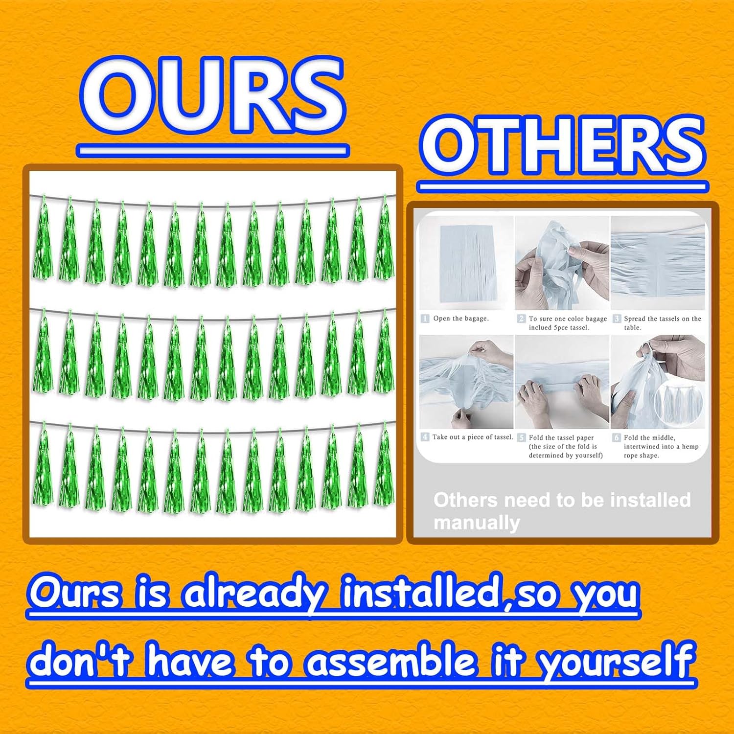 - 【Premium Reusable Tassel Material】: Our glitter fringe garland is made of high-quality PET material, with the virtue of nice craftsmanship and light weight which is safe and recyclable. And the smooth touch makes tassels easy to tidy up. They come with white ribbon for hanging, and garland tassels hang perpendicular to the string, and are adjustable to provide you with the option of spreading the tassels out or piecing them closer together.
