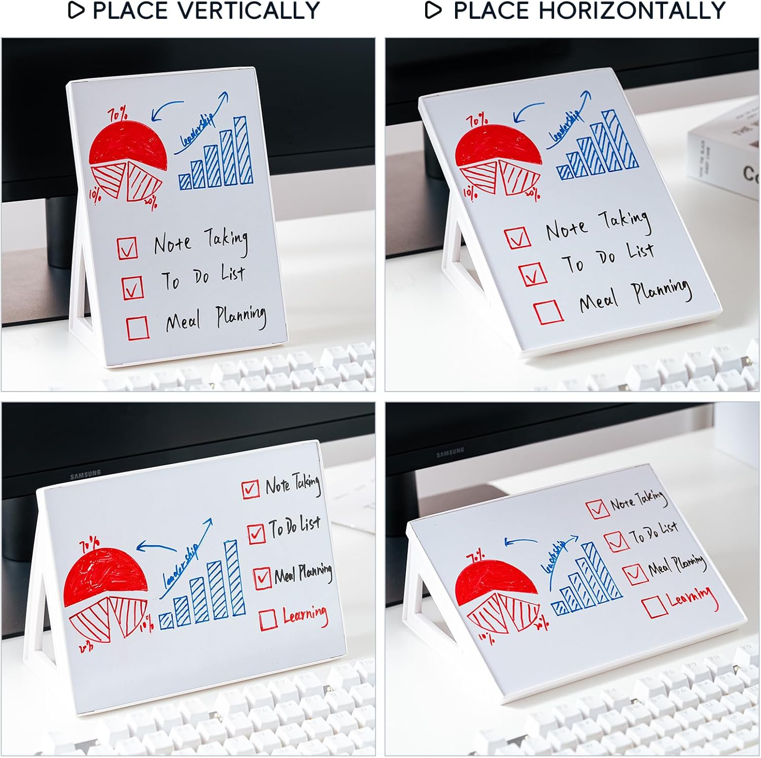 - 【Desktop White board with Dry Erase Pen】Explore your creativity with the convenience of a desktop whiteboard, complete with a complimentary dry erase pen.