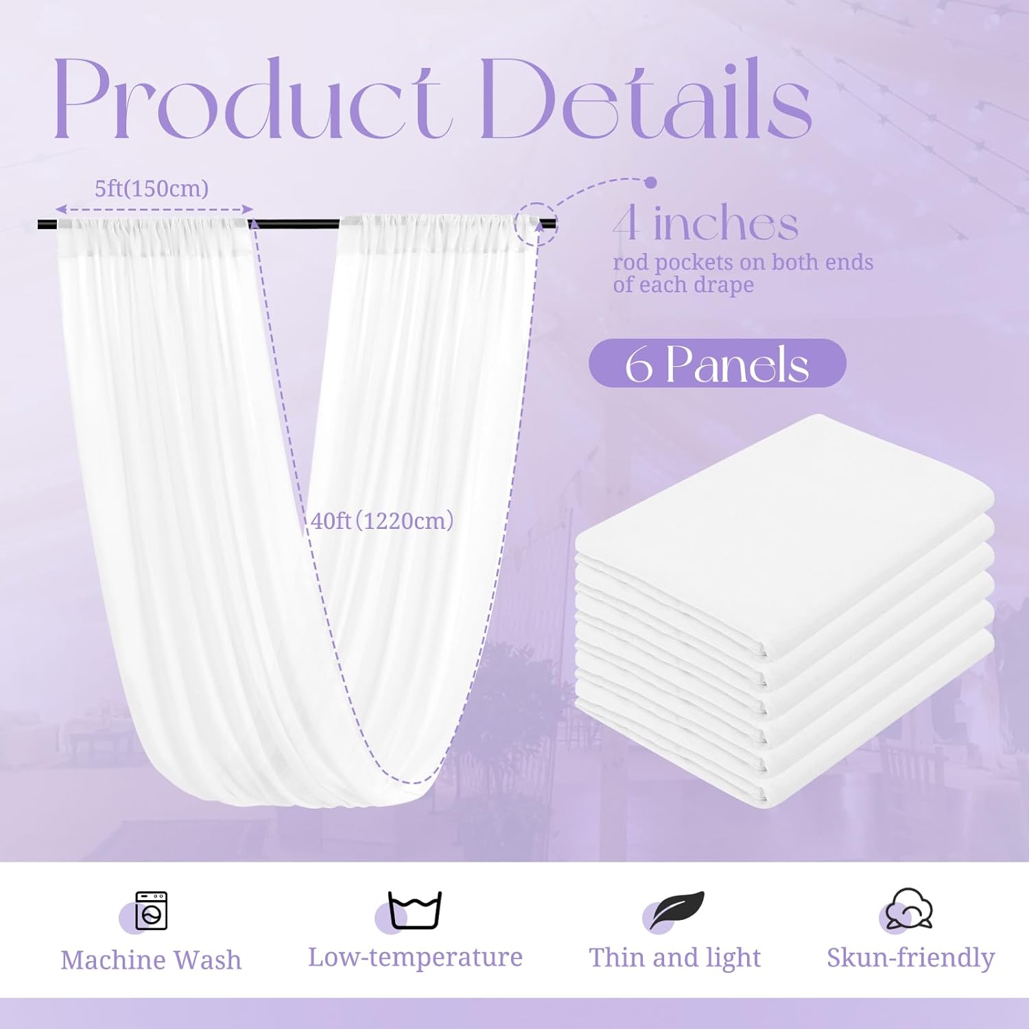- 【Package Includes】The package will include 6 panels white wedding ceiling drapes (Not include stand), each wedding extra long curtain measures 5 feet (60inch)wide x 40 feet(480inch) long.The sufficient quantity can meet your demands for decorating your weddings, parties, receptions.