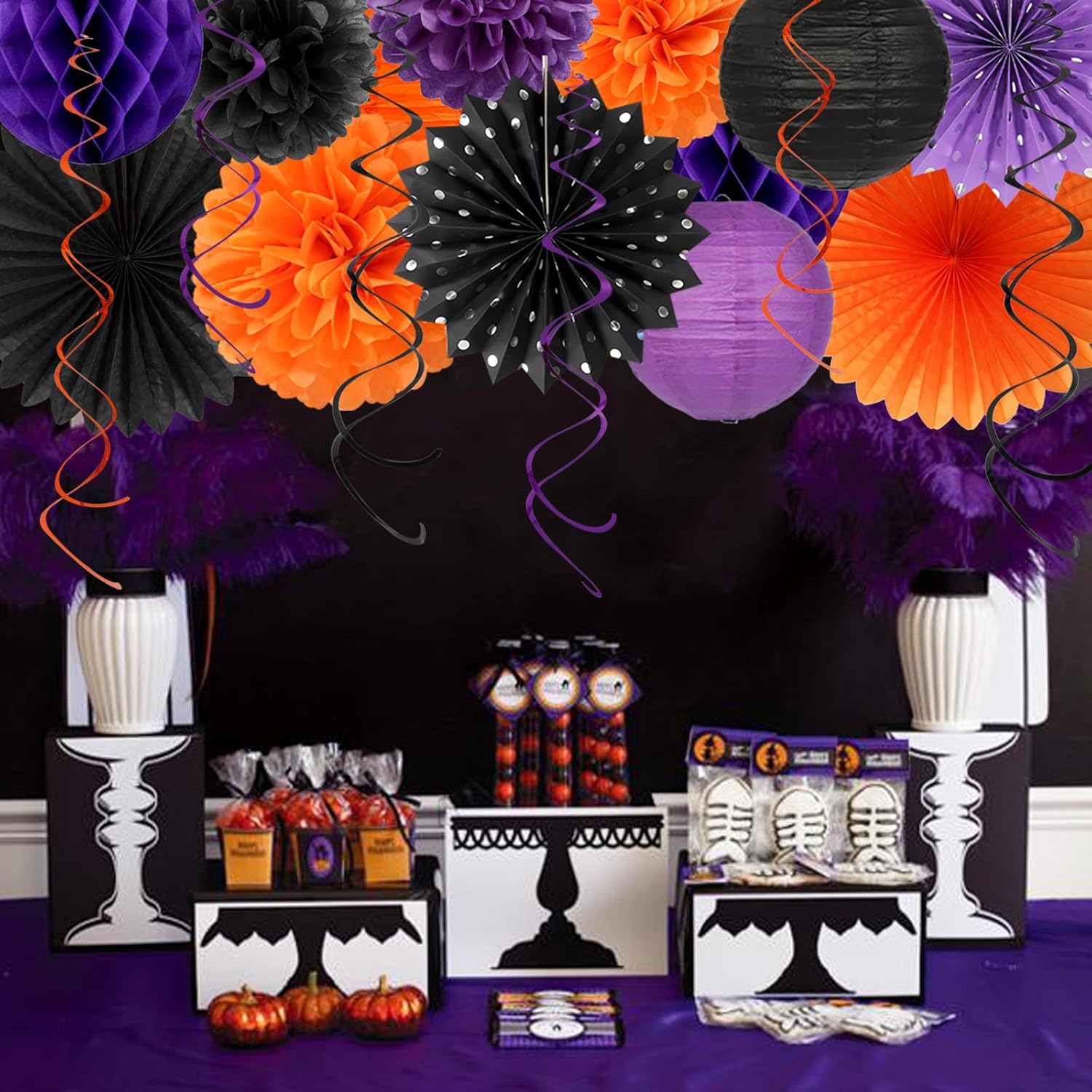 Black-Purple Orange Happy-Halloween Party-Decorations - 21pcs Birthday Banner,Paper Lanterns Honeycomb,Tissue Pom Poms Flower Fan,Kids Classroom Hanging Streamers Garland Decor Supplies Huglony