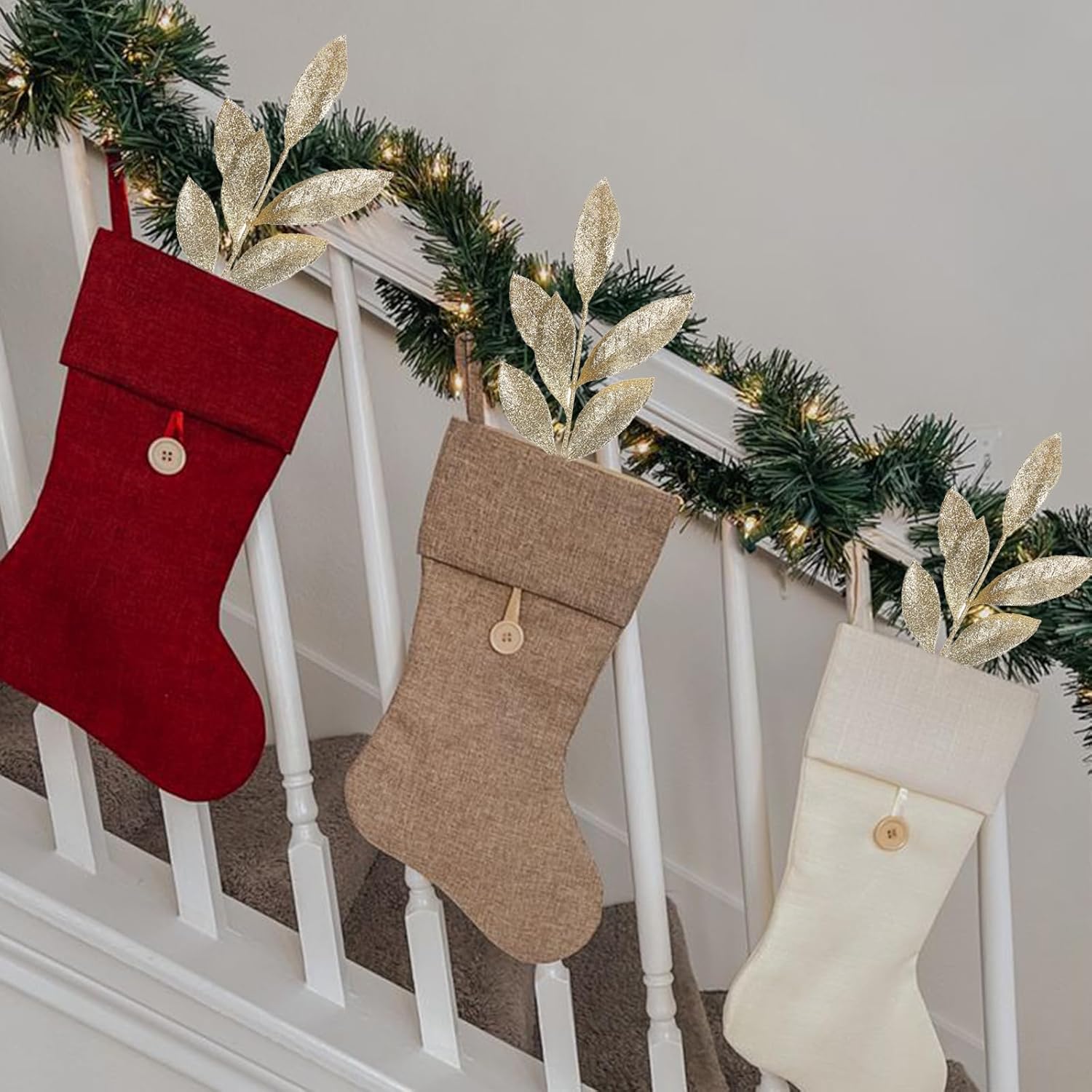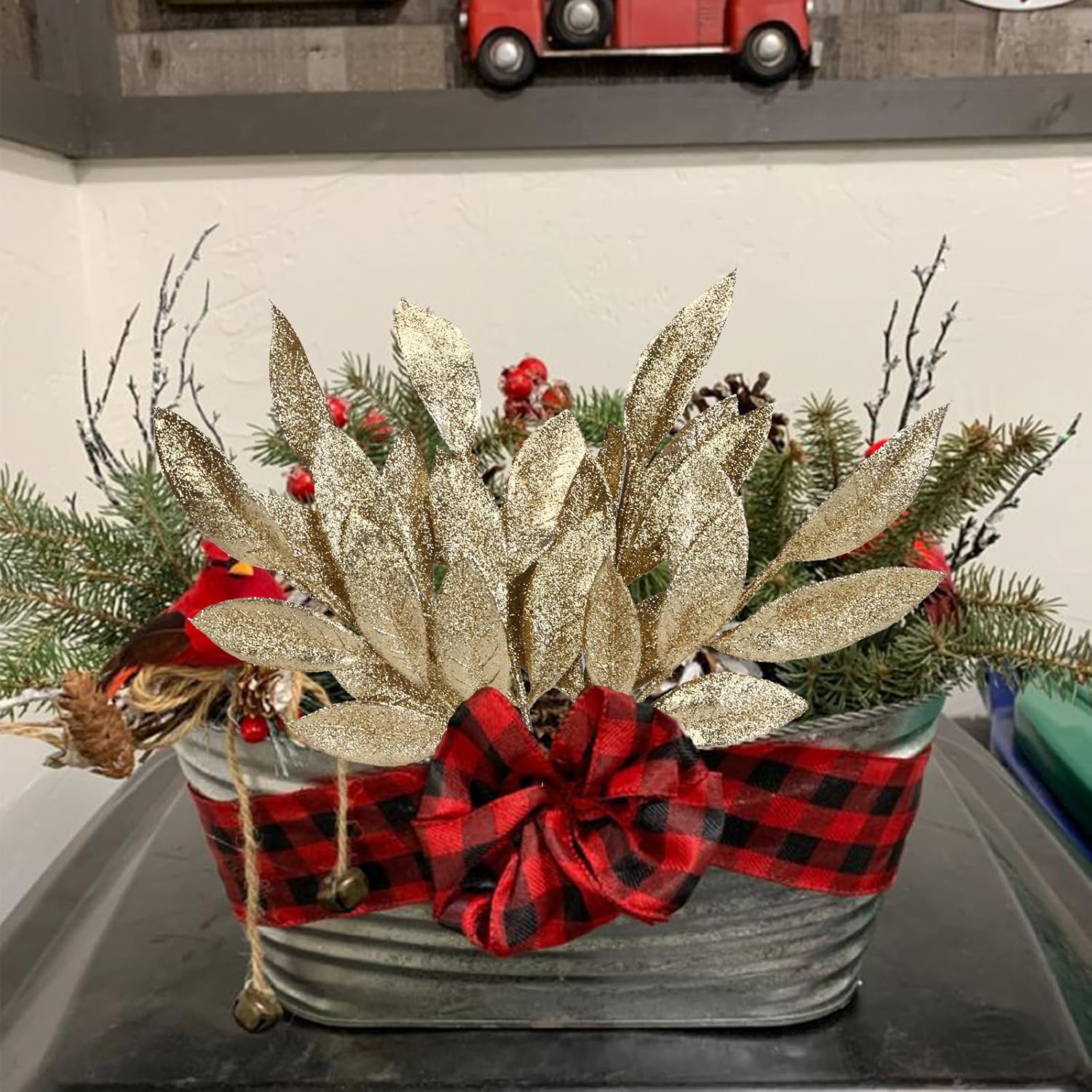 GREENTIME 12 Pack Artificial Light Golden Glitter Leaves 13" Fake Christmas Picks Decorative Glitter Sticks for Vase Christmas Tree DIY Wreath Crafts Fireplace Decor