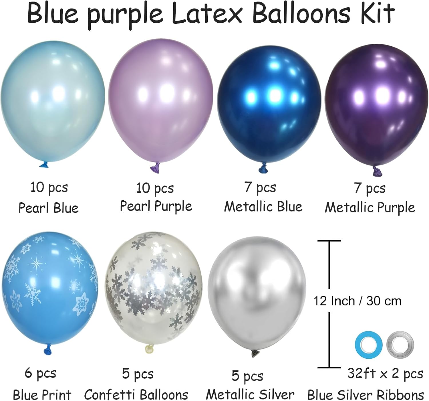 - 【All-in-One Kit】: This purple blue white and silver balloons kit includes everything you need to create a stunning decoration, metallic chrome silver balloons 5pcs, metallic chrome blue balloons 7pcs, metallic chrome purple balloons 7pcs, silver snow confetti balloons 5pcs, snow blue print balloons 6pcs, pearl blue balloons 10pcs, pearl purple balloons 10pcs, 2pcs silver blue balloon ribbons 32ft. The size of the balloon is about 12 inches after inflation. the synergy of purple blue silver balloon balloons can make any party or occasion more elegant.