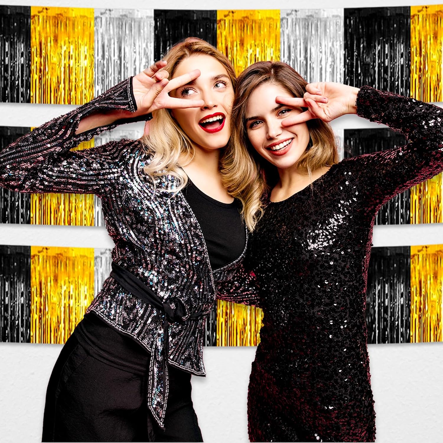 6 Pack 10 Feet Black Gold Silver Foil Fringe Garland Metallic Tinsel Streamers Banner Wall Hanging Curtain Backdrop for Parade Floats, Birthday, Graduate, Mother's Day, Wedding Party Decoration
