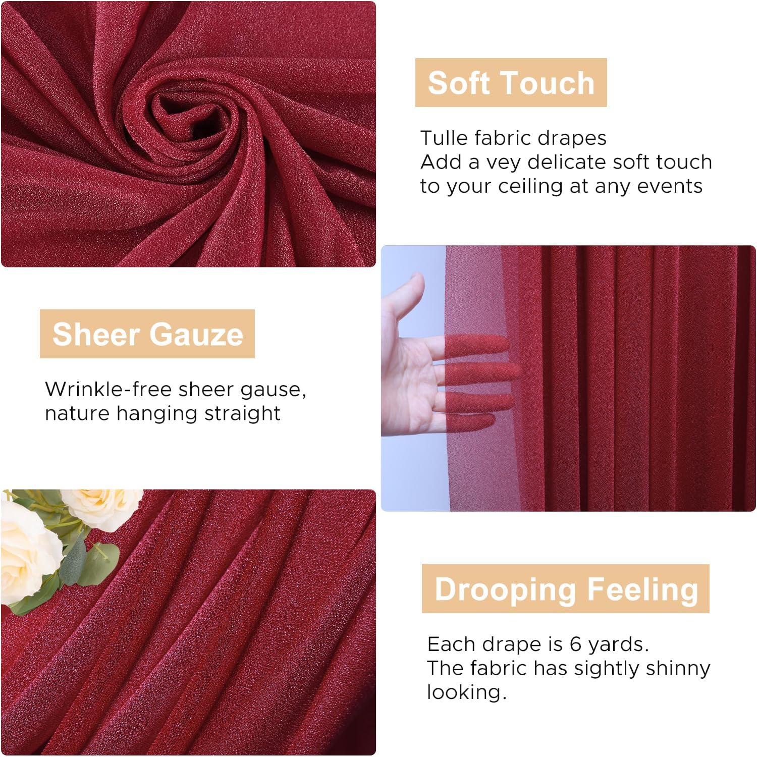 - Soft Wedding Drapes: Sheer drapes backdrop for wedding arch decor are made of polyester fabric, touch silky soft. These arch draping fabric is lightweight, easy to hang vertically with natural sagging, wrinkle-free, durable and reusable